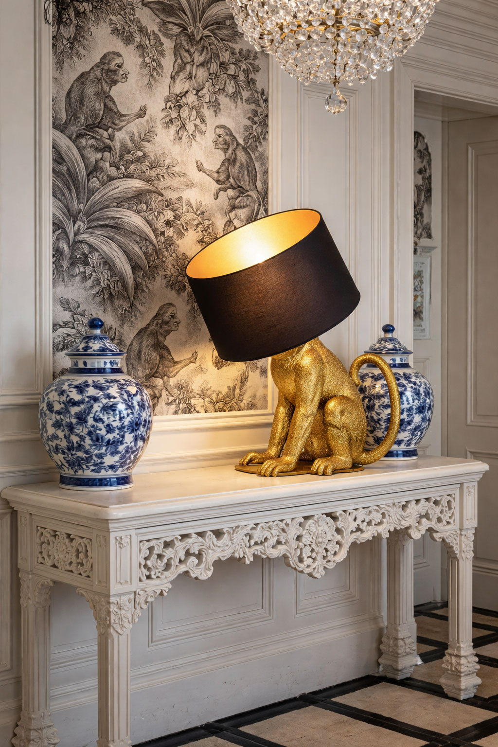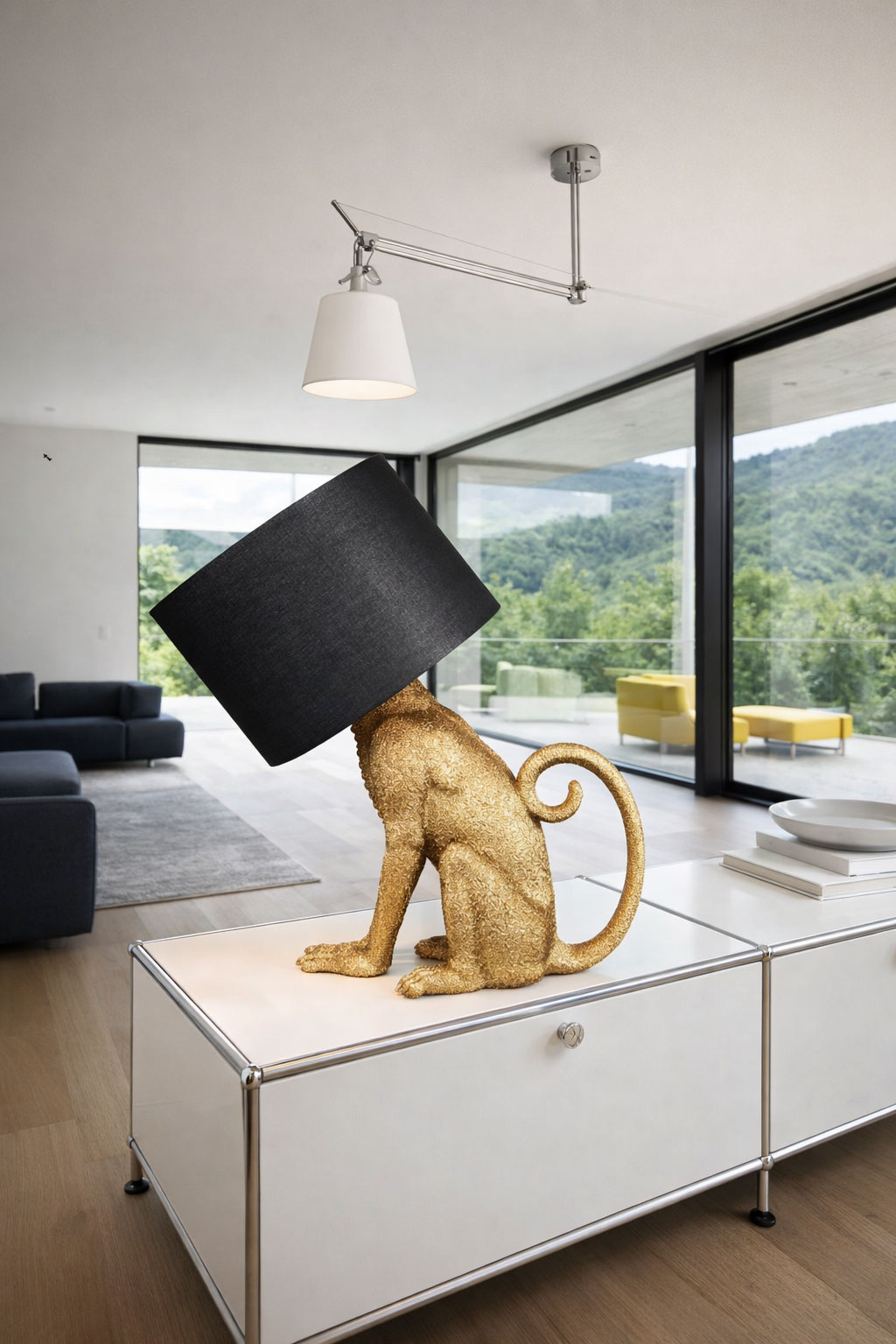 Diese große Affenlampe im „Jungle Chic“-Design vereint extravaganten Glamour mit exotischem Flair. Die goldfarbene Affenfigur in Kombination mit schwarzem Stoffschirm macht die Leuchte zu einem ausdrucksstarken Statement-Piece und stilvollen Blickfang in jedem modernen Interieur.