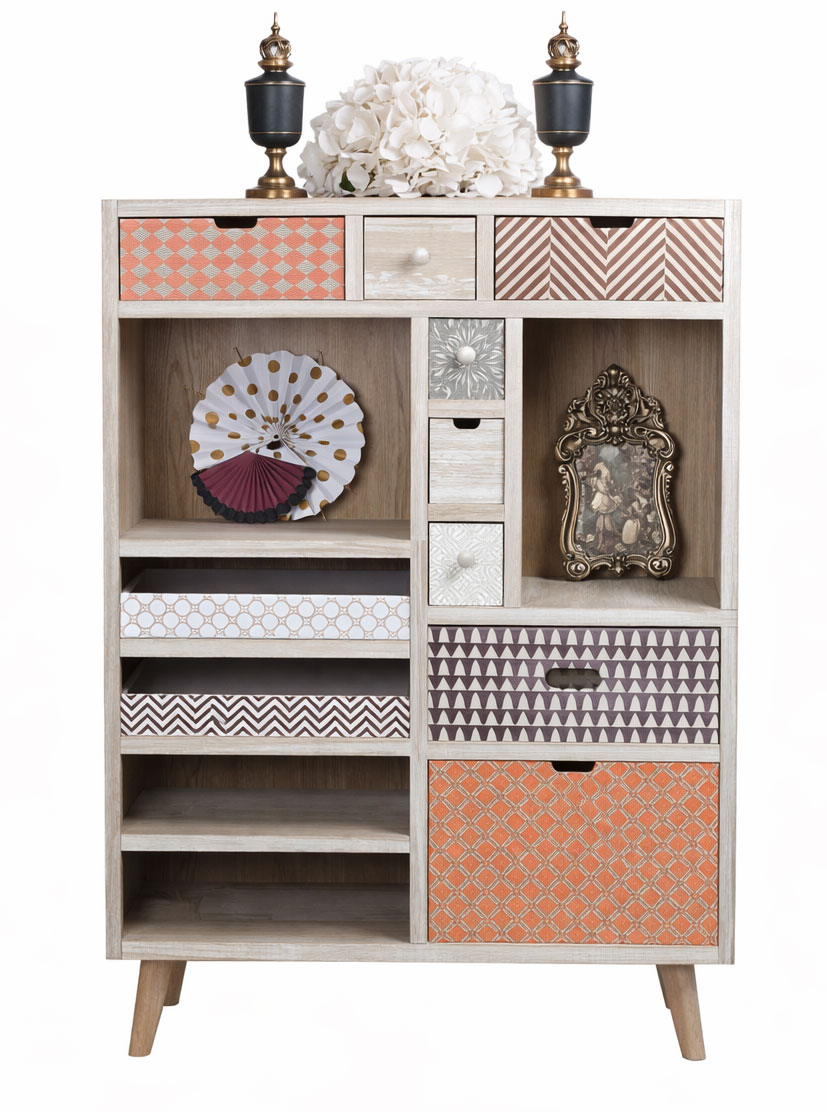 Der schlichte Korpus wird durch insgesamt zehn Schubladen sowie offene und geschlossene Fächer aufgelockert und bietet viel Stauraum mit individueller Aufteilung.