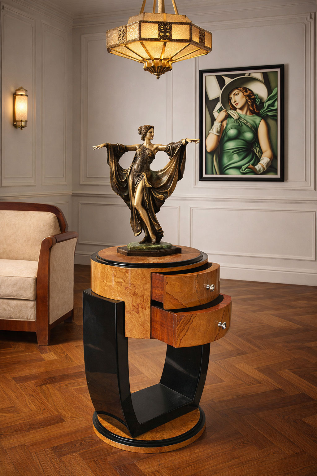 Ob in einem klassischen Art-Deco-Interieur oder als glamouröser Akzent in modernen Räumen – dieser Tisch verleiht jedem Ambiente den Flair einer schillernden Zeit voller Eleganz und Stilbewusstsein.