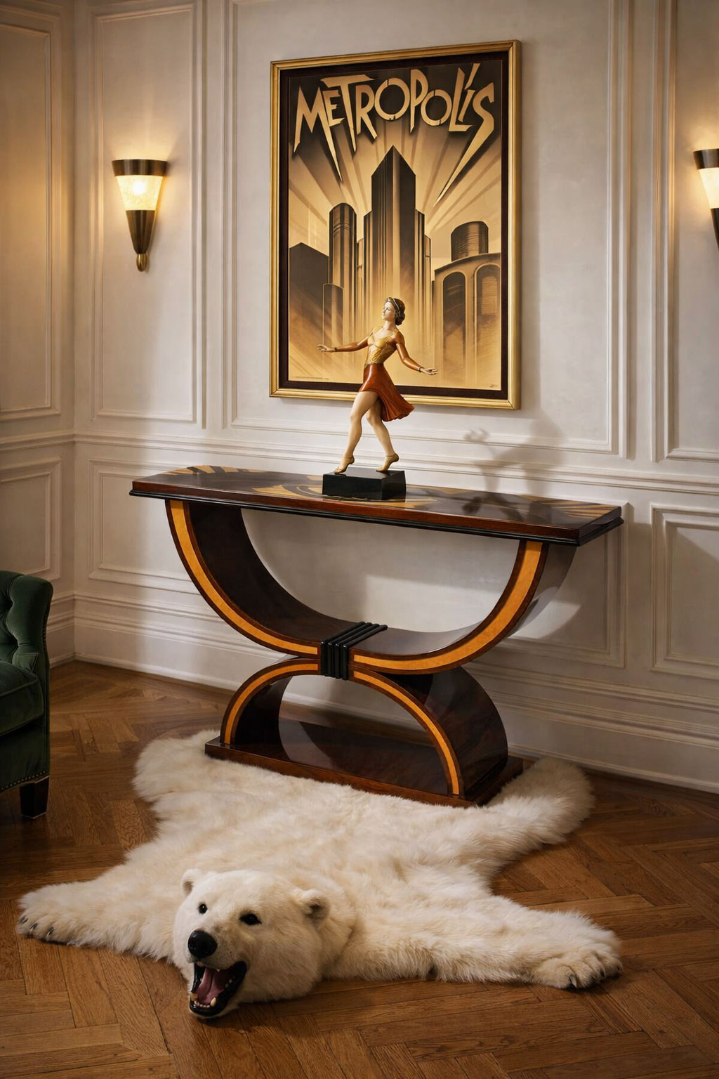 Die klare, architektonische Linienführung ist typisch für das Art Deco Design und verleiht der Konsole eine zeitlose, mondäne Präsenz.