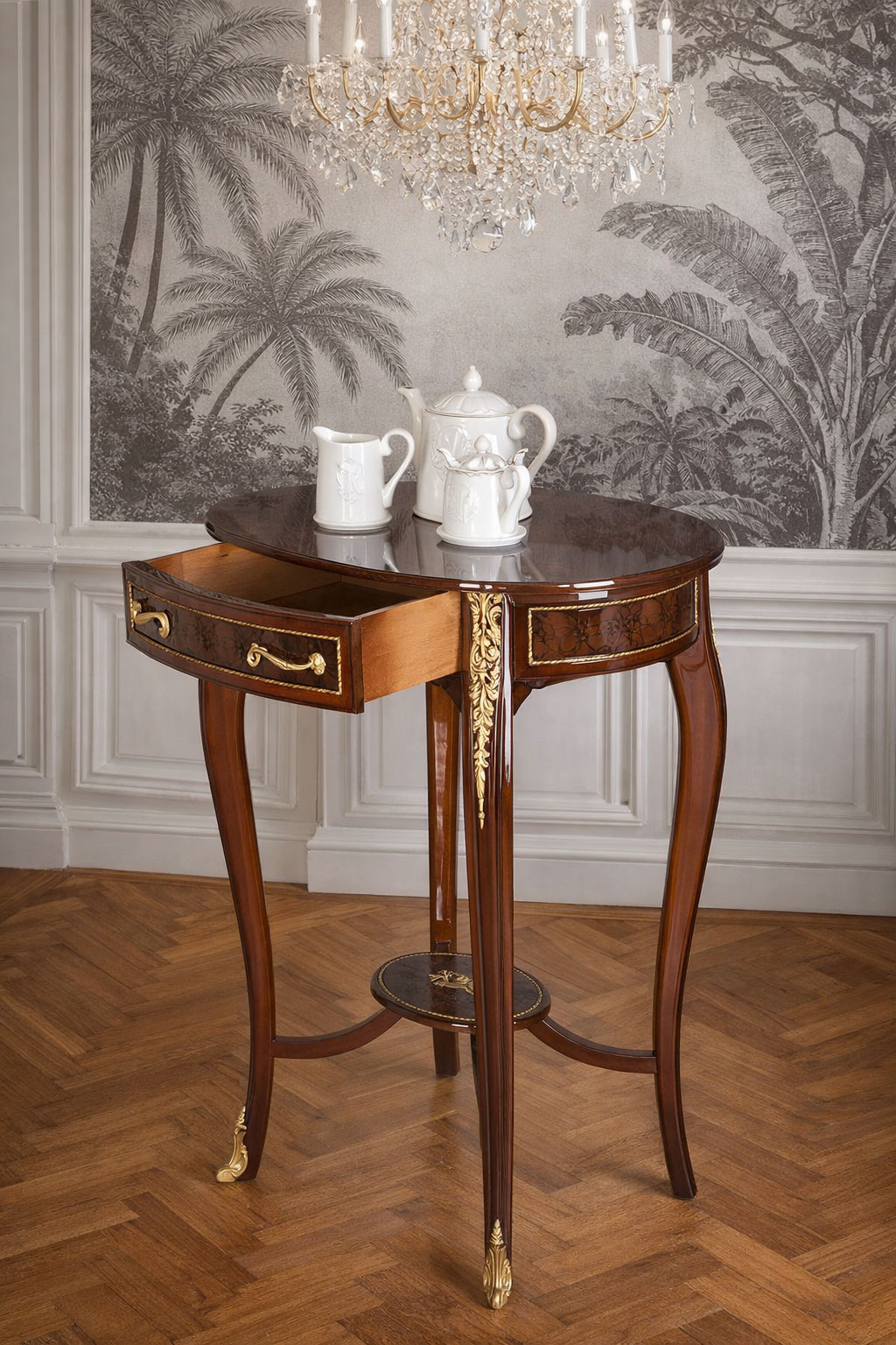 Ein Hauch französischer Hofkultur: Der Beistelltisch „Marquise de Montespan“ begeistert mit edlen Intarsien, geschwungenen Barockformen und luxuriösen Messingdetails – ein stilvolles Highlight für anspruchsvolle Interieurs. Höhe ca. 84 cm / Breite ca. 60 cm / Tiefe ca. 47 cm Ohne Dekoration