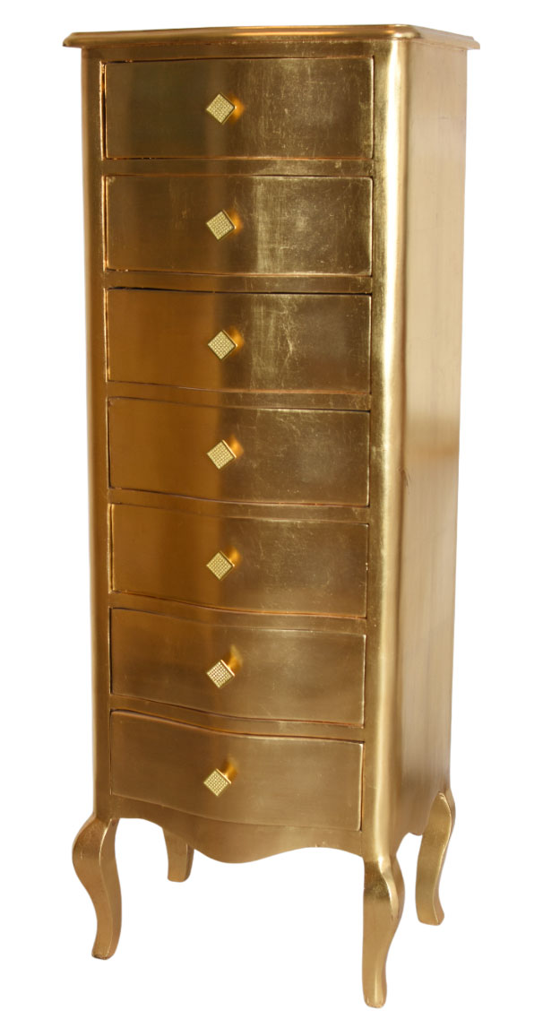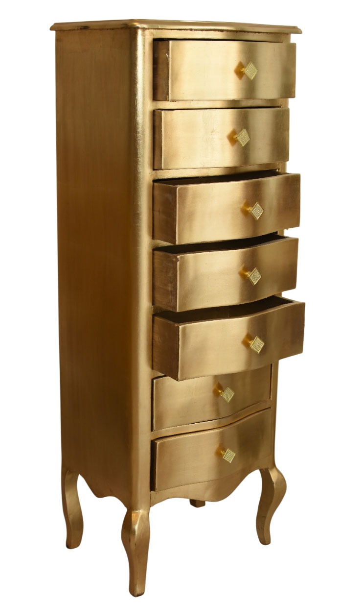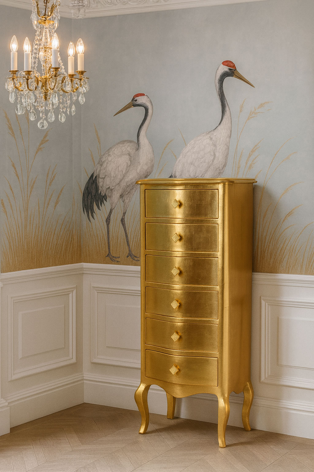 Die Barock Hochkommode „Château de Versailles“ begeistert mit sieben Schubladen, Blattvergoldung und elegant geschwungenen Füßen. Ein schlankes, prunkvolles Stilmöbel, das jedem Raum einen Hauch königlicher Eleganz verleiht.