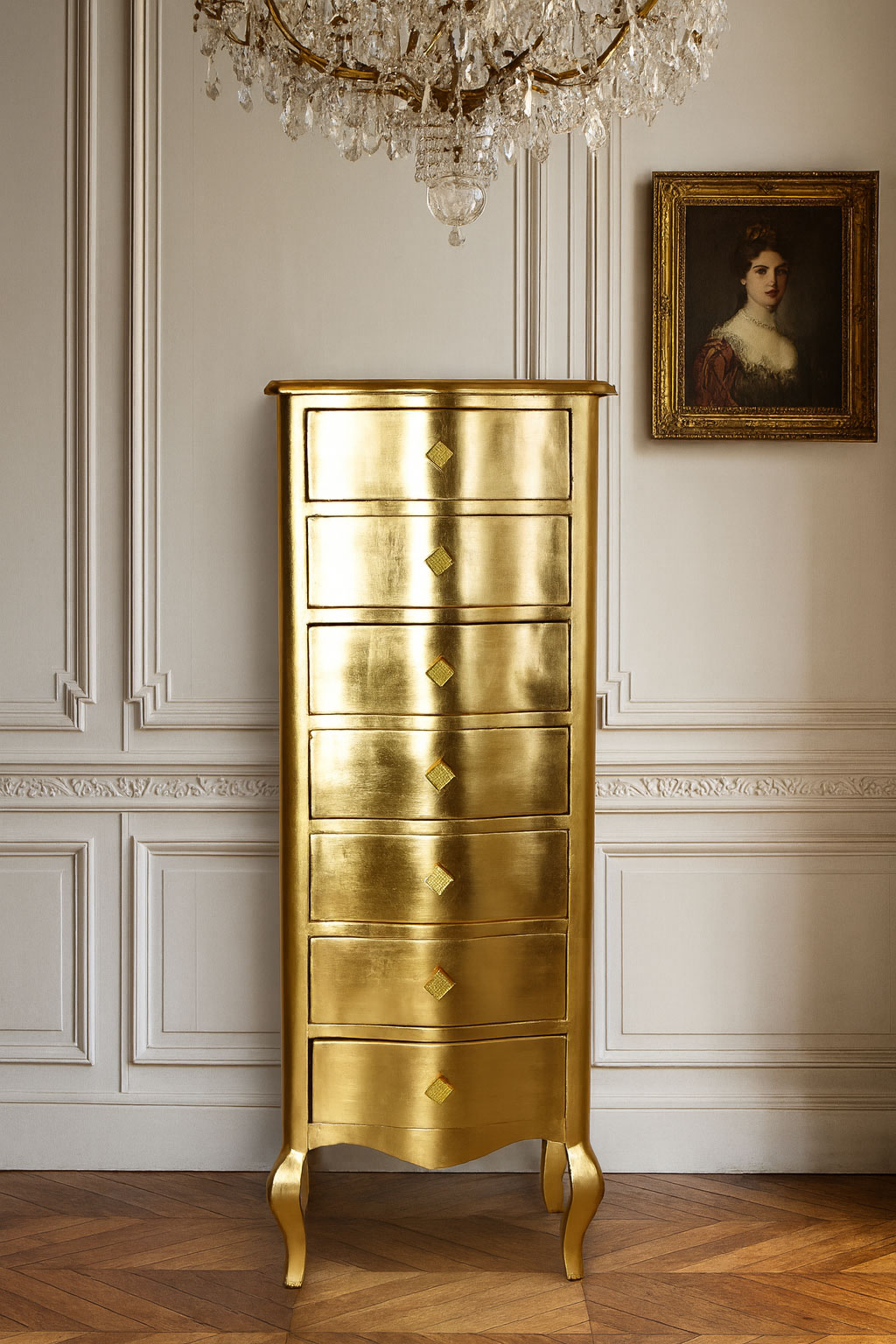 Gefertigt aus massivem Holz und veredelt mit einer luxuriösen Blattvergoldung, besticht diese Hochkommode durch ihre königliche Ausstrahlung und detailreiche Verarbeitung.