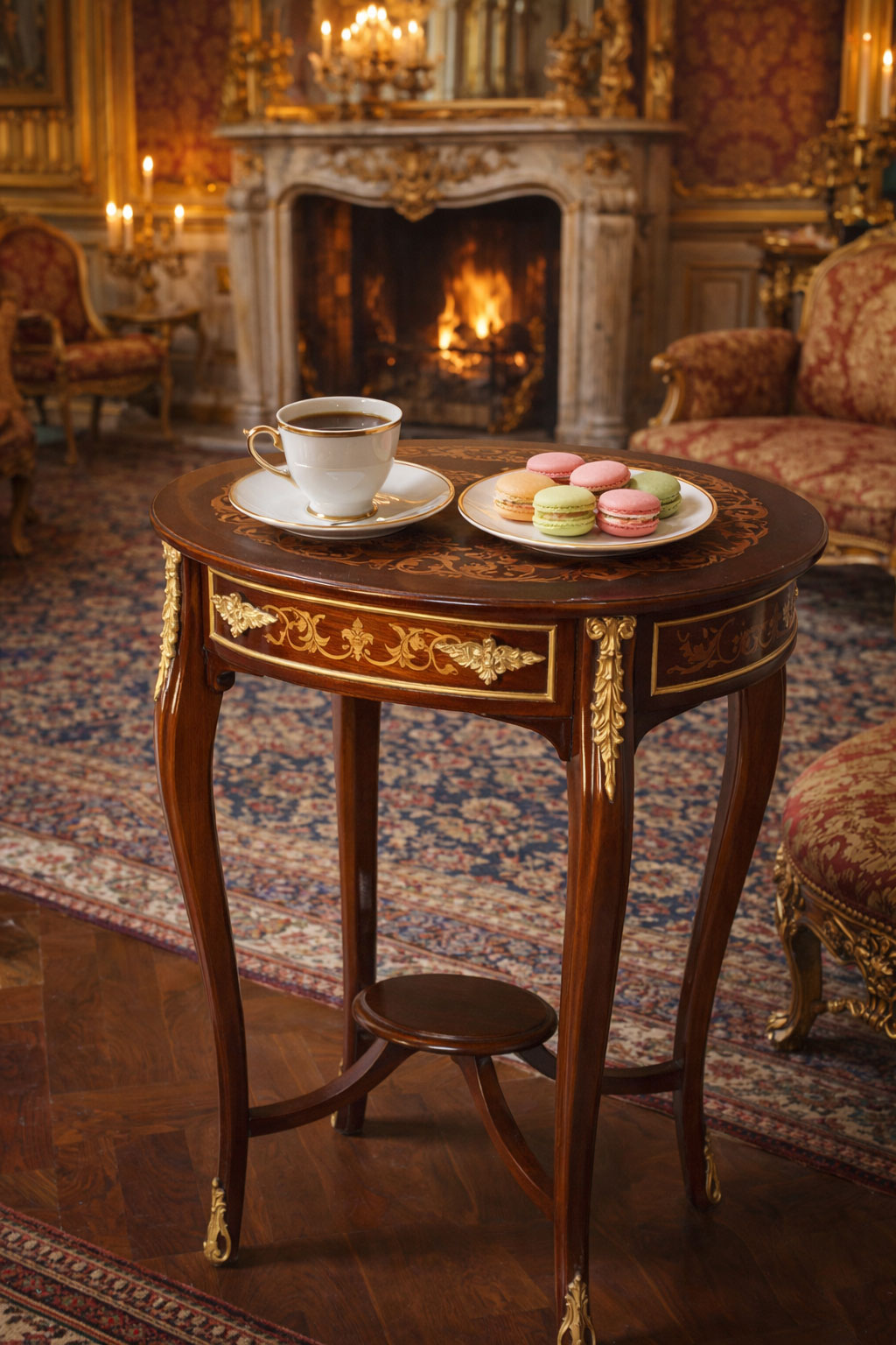 Ein barocker Kaffeetisch voller Eleganz: Der „Marquise de Montespan“ vereint edle Intarsien, geschwungene Formen und historische Handwerkskunst – ein luxuriöses Highlight für stilvolle Wohnräume. Höhe ca. 84 cm / Breite ca. 60 cm / Tiefe ca. 47 cm