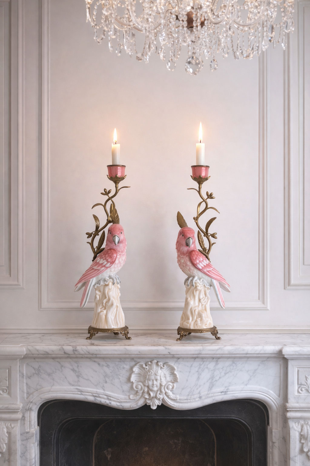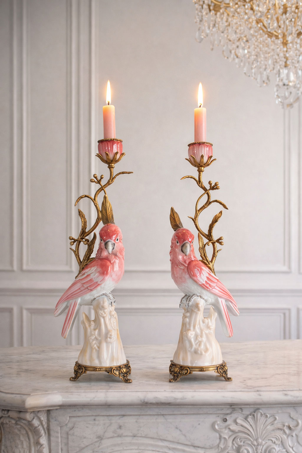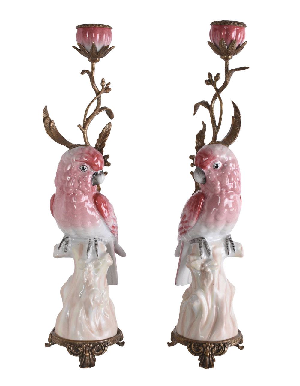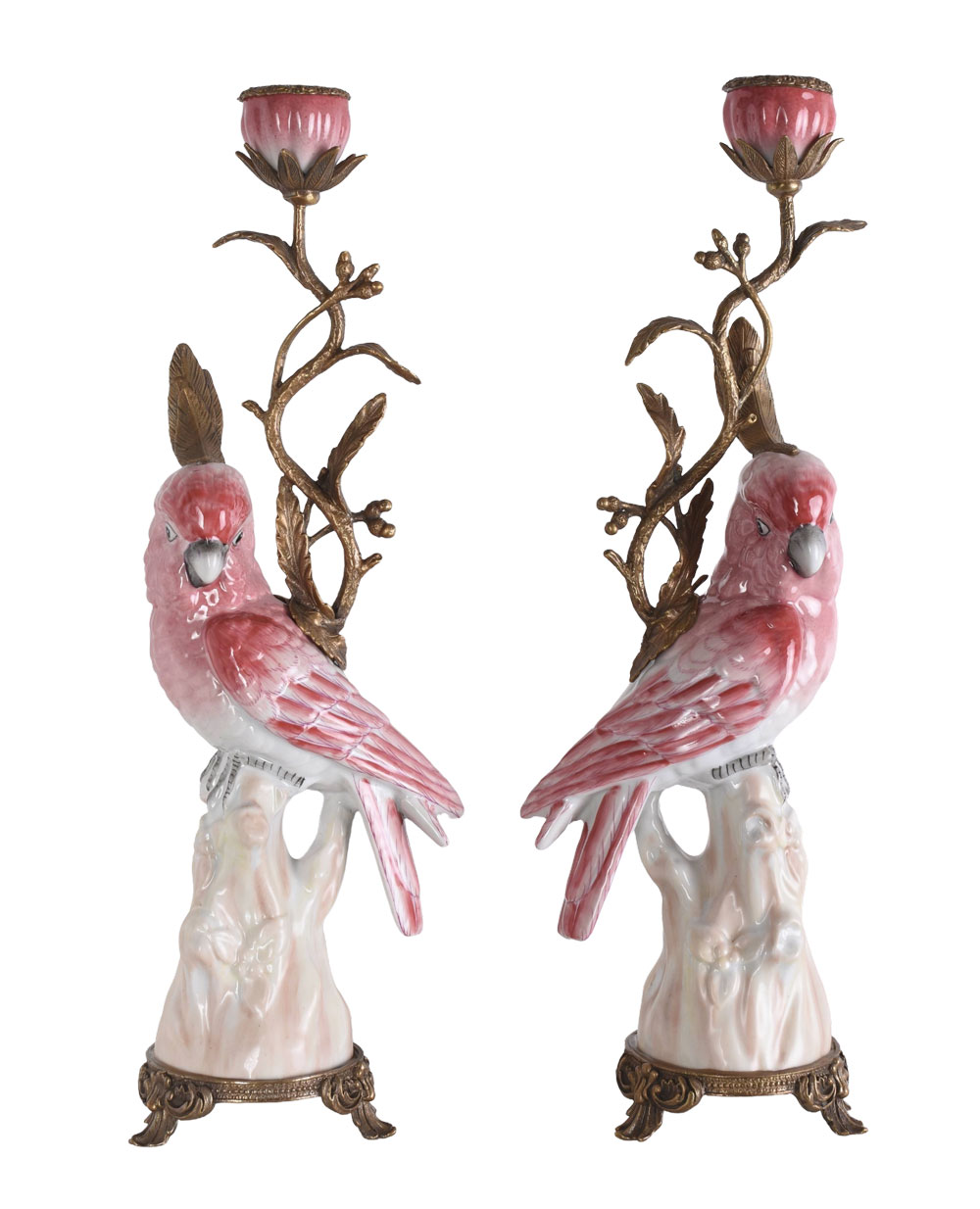 Zwei filigran ausgearbeitete Papageien verleihen den Leuchtern eine lebendige, exotische Ausstrahlung und machen sie zu außergewöhnlichen Blickfängen.