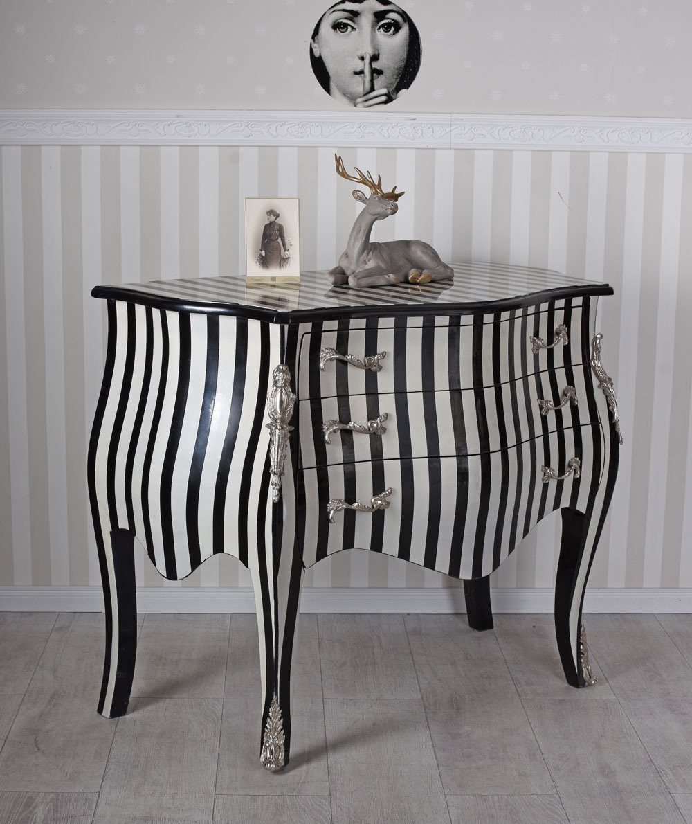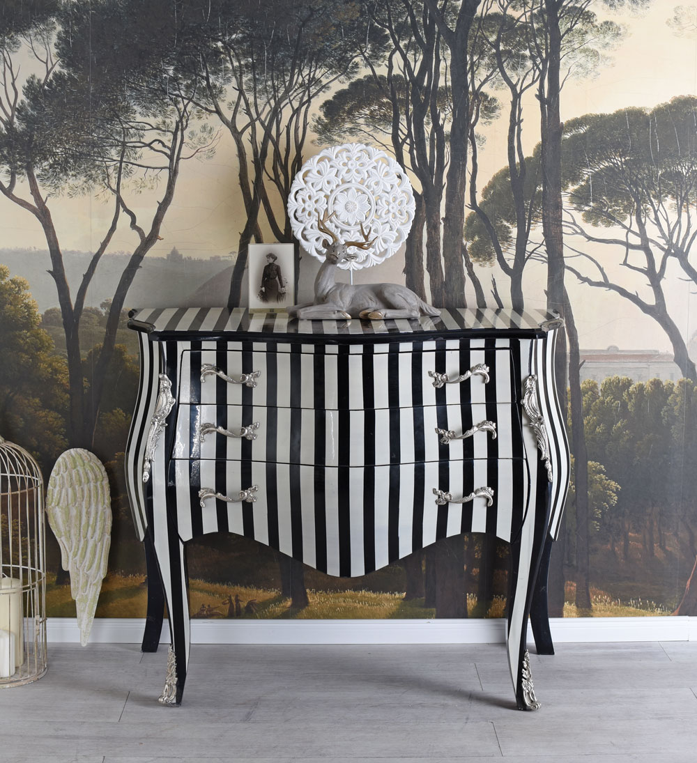 Die Kommode „Chateau Monfort“ verbindet geschwungene Barock-Formen, silberfarbene Beschläge und handwerkliche Fertigung zu einem stilvollen Stilmöbel mit authentischem Antik-Charakter.