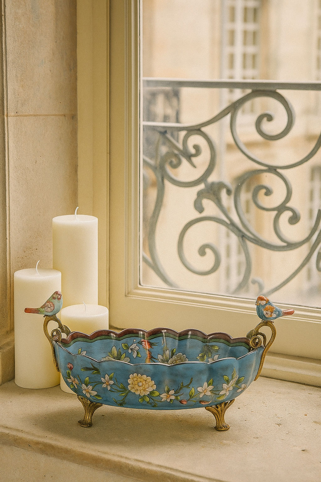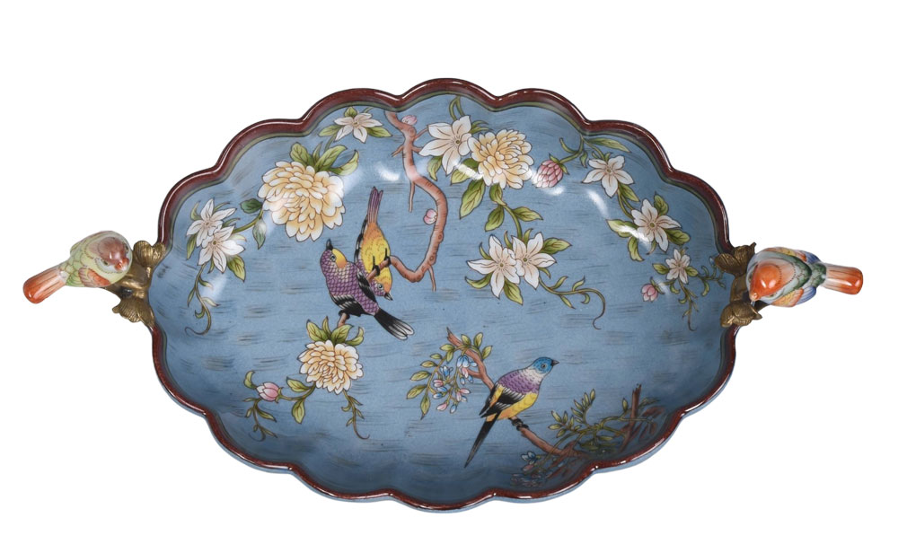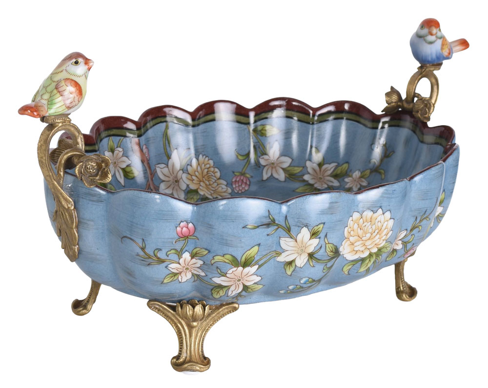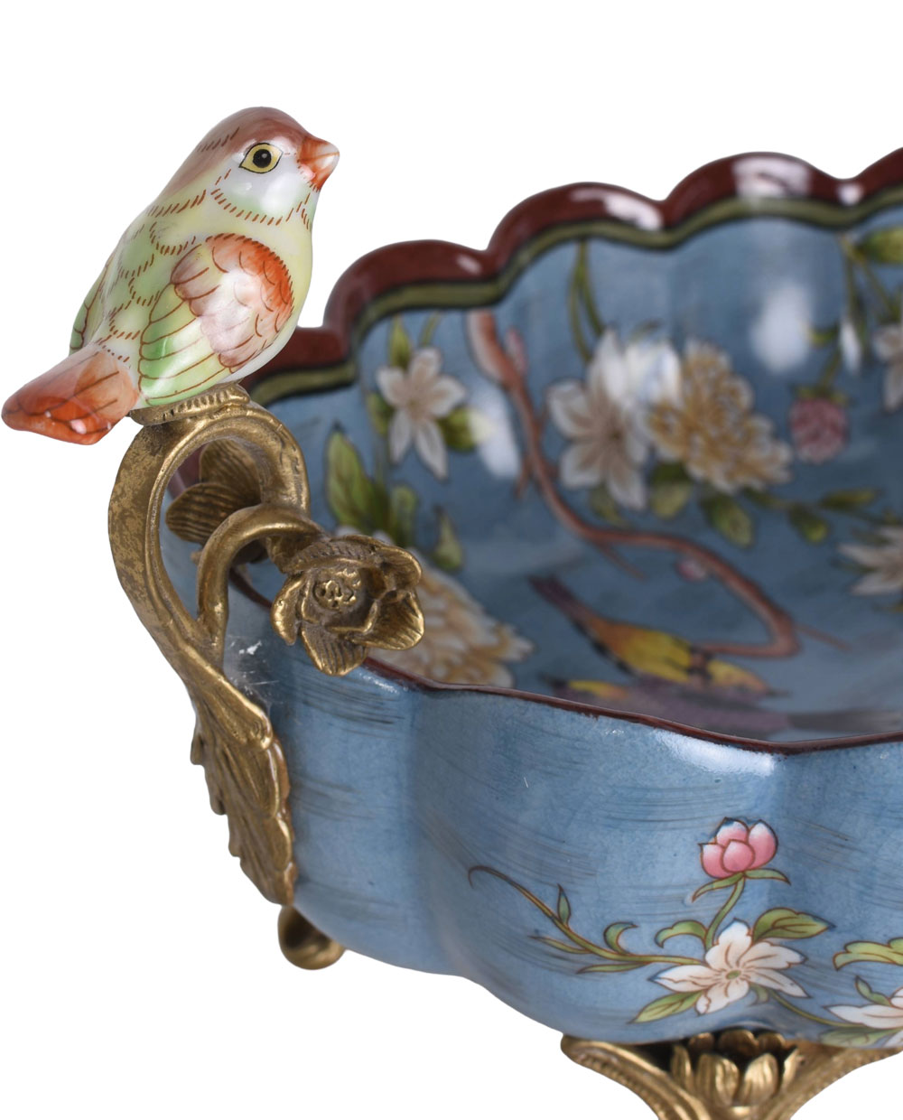 Gefertigt aus handbemaltem Porzellan mit edler Krakelee-Glasur, beeindruckt sie durch ihre detailreiche Blumenmalerei und fein ausgearbeitete Vogel-Figuren als Henkel, die die elegante Form der Schale kunstvoll betonen.