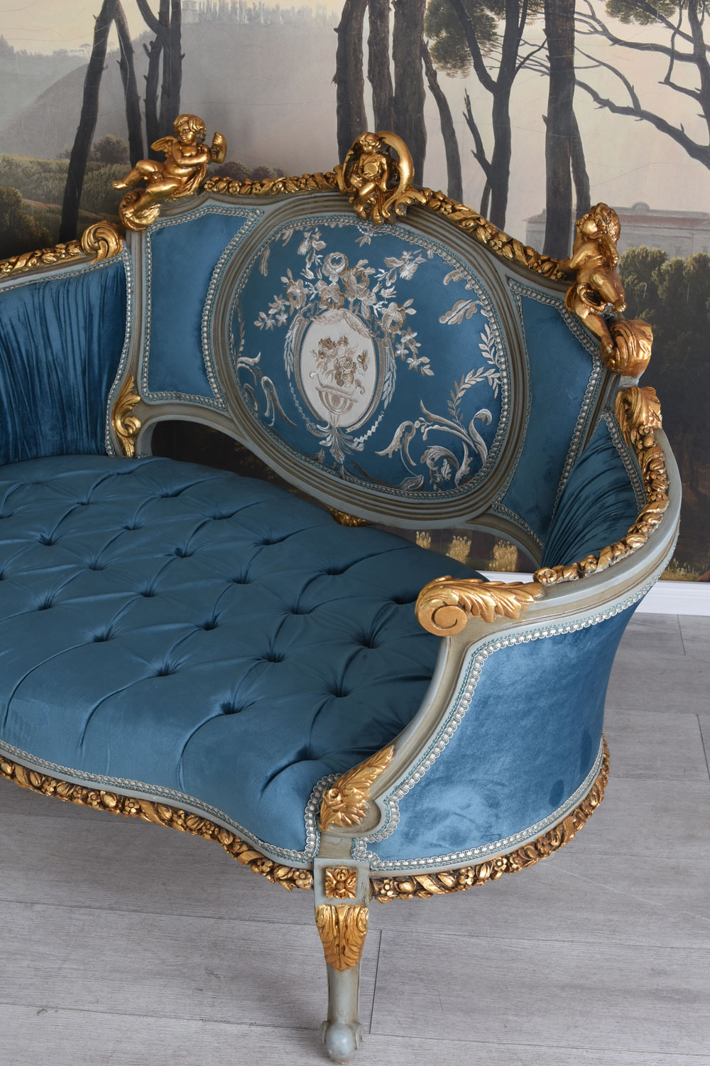 Der aufwendig gestaltete Zargenrahmen aus massivem, handgeschnitztem Holz ist reich mit kunstvollen Ornamenten verziert. Besonders eindrucksvoll sind die dekorativen Amoretten (Engelsfiguren), floralen Schnitzereien und geschwungenen Rokoko-Elemente, die dem Sofa seine luxuriöse und historische Ausstrahlung verleihen. Die detailreiche Handarbeit macht dieses Möbelstück zu einem echten Kunstobjekt mit unverwechselbarem Charakter.