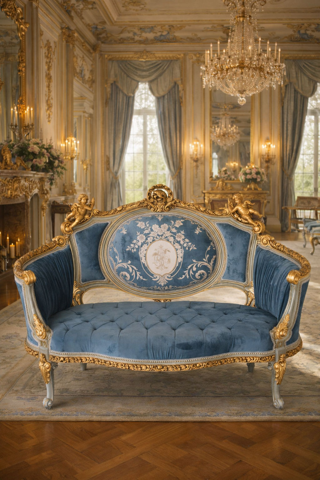 Luxuriöses Barock Sofa „CHATEAU MADAME“ mit handgeschnitztem Holzrahmen, Amoretten und edlem Samtbezug im Rokoko-Stil – prachtvolles Kanapee im Schlossdesign.