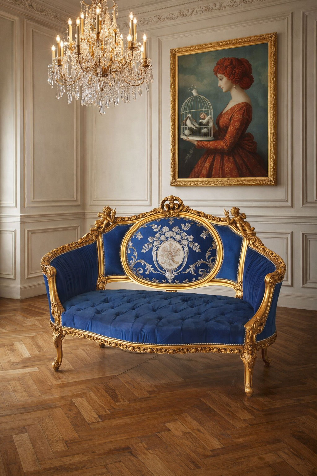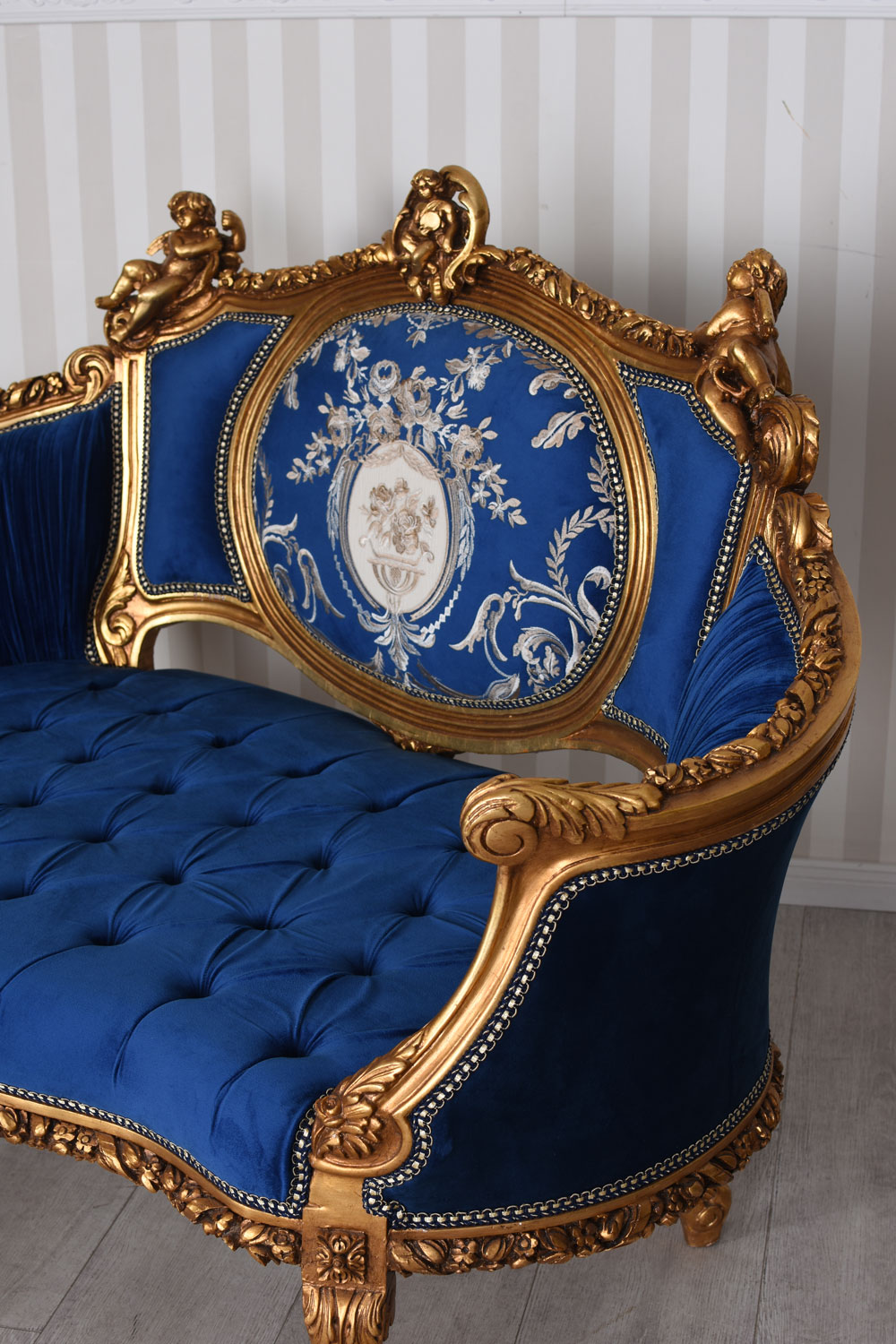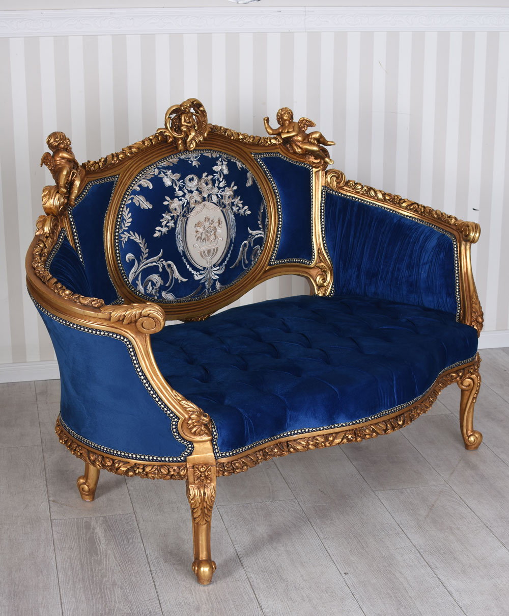 Das prachtvolle Barock Sofa „Chateau Madame“ in Royalblau vereint opulente Rokoko-Eleganz mit kunstvoller Handarbeit. Mit handgeschnitzten Amoretten, reich verziertem Holzrahmen und edlem Samtbezug wird dieses luxuriöse Boudoir-Kanapee zum eindrucksvollen Blickfang im Schlossstil.