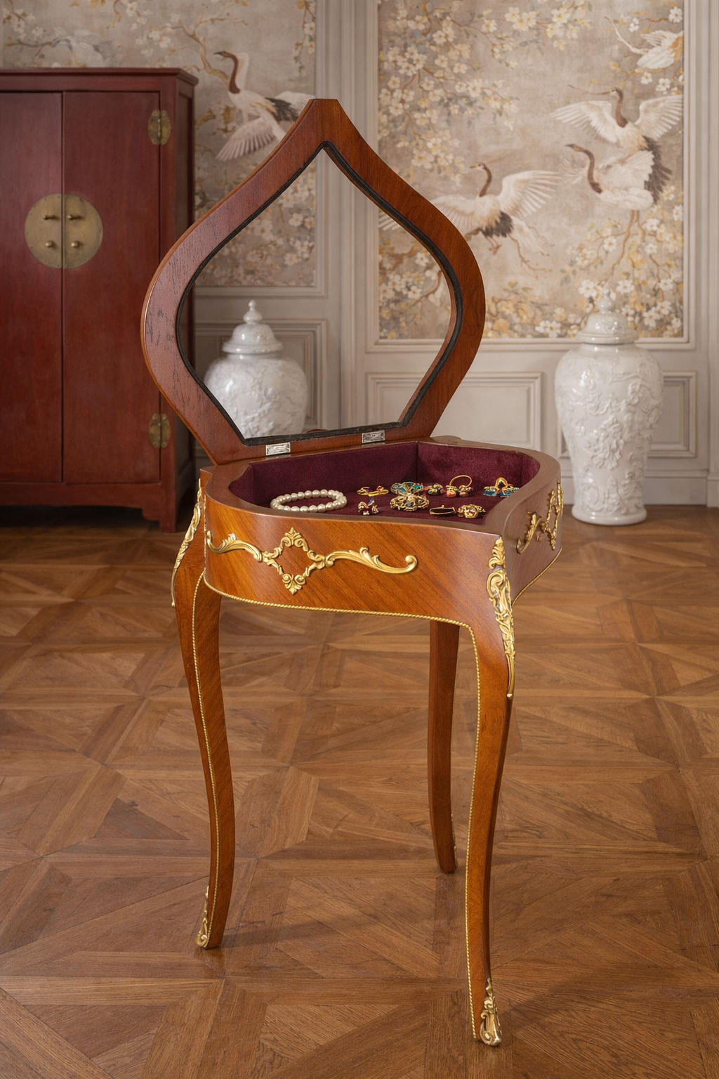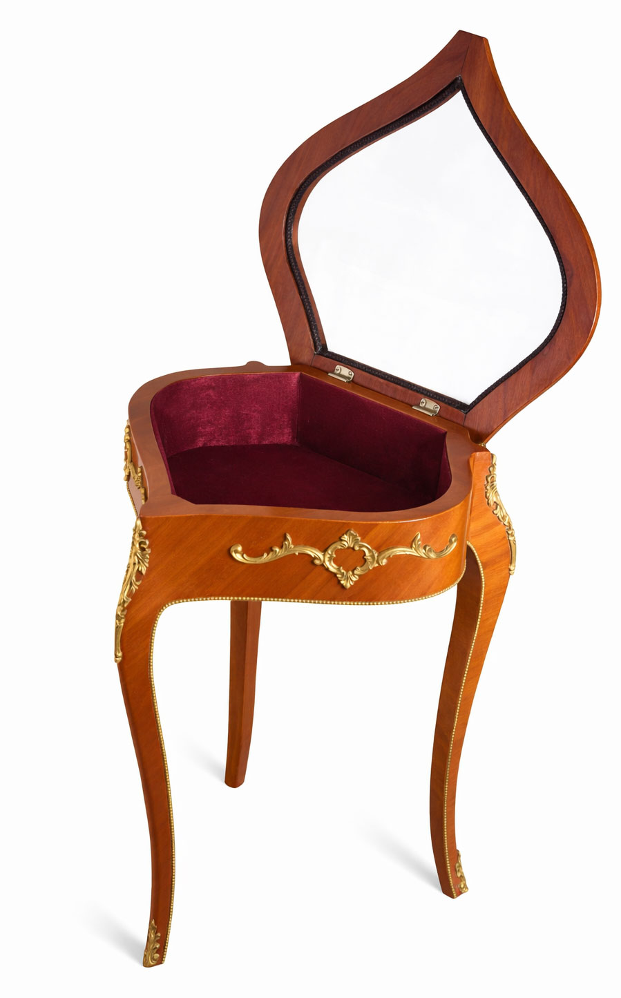 Romantische Tischvitrine in Herzform im opulenten Barockstil – handgearbeitet aus Massivholz, mit Glasdeckel, Samtauslage und edlen Messingdetails. Ein einzigartiges Stilmöbel für Schmuck und Kostbarkeiten.