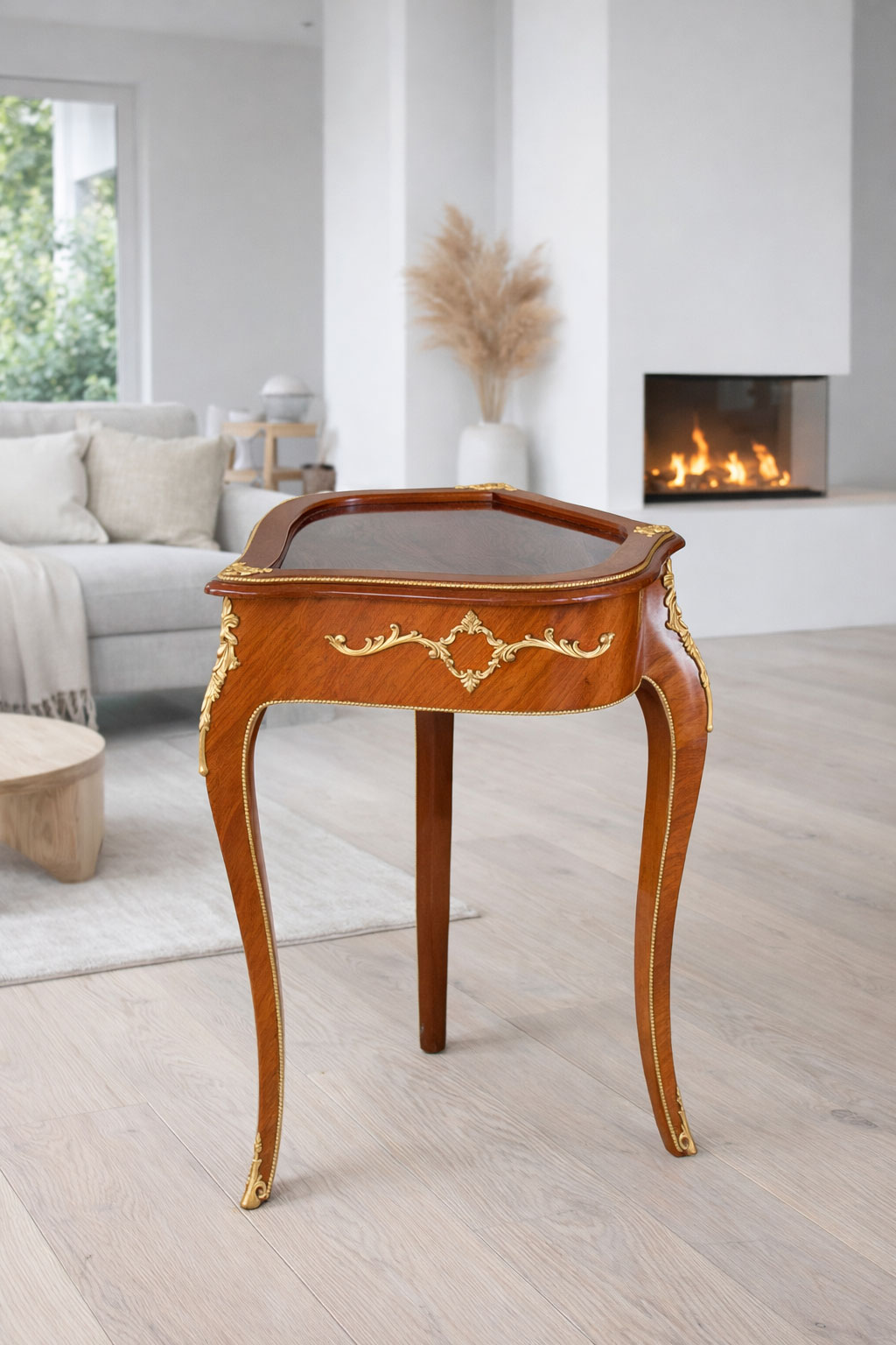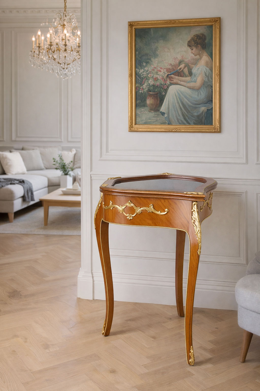 Jede Perspektive offenbart neue Details: geschwungene Linien, harmonische Proportionen und dekorative Verzierungen machen die Tischvitrine zu einem dekorativen Kunstobjekt, das sowohl im Salon, Boudoir, Schlafzimmer als auch in einer exklusiven Boutique eine eindrucksvolle Wirkung entfaltet.