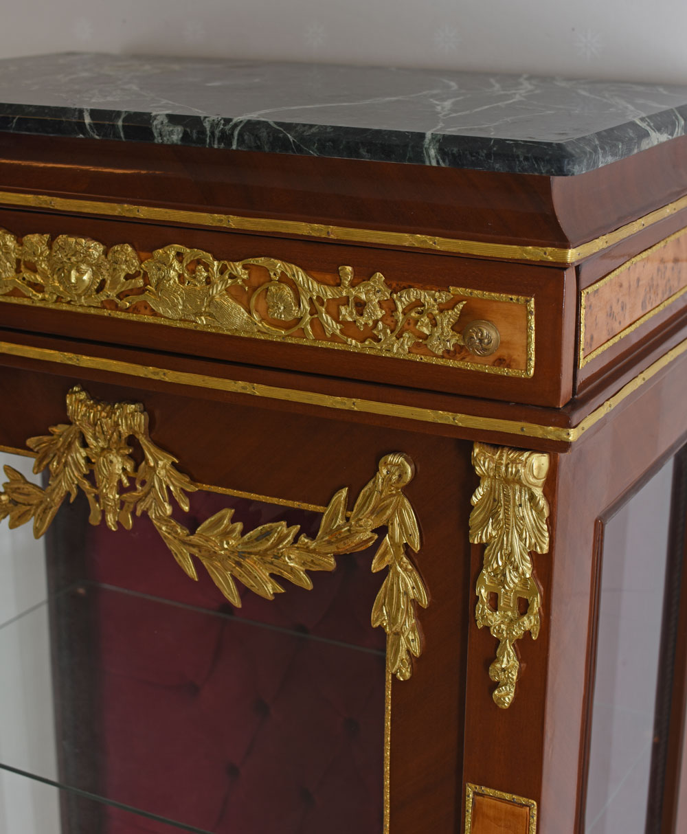 Barock-Vitrine „Madame Pompadour“ – prachtvolle Holzvitrine mit Wurzelholzfurnier, Marmorplatte & Metallverzierungen. Allseitig verglast, 3 Regalböden & Schublade. Luxus pur im Stil des französischen Barock.
