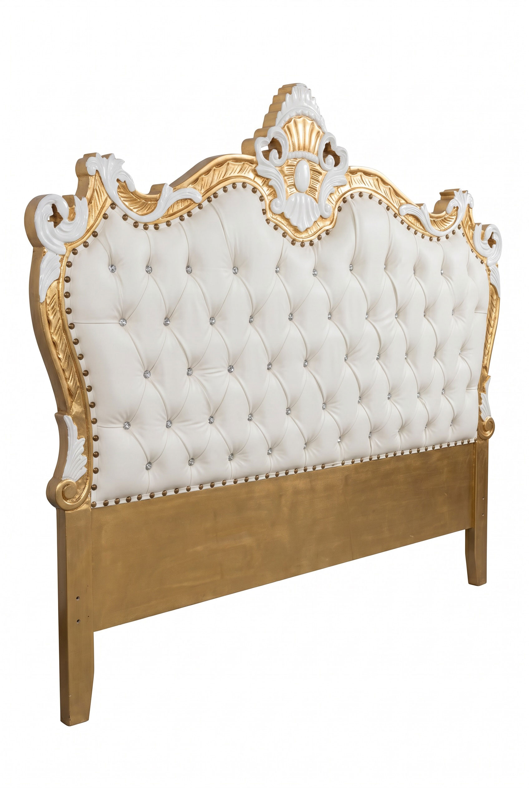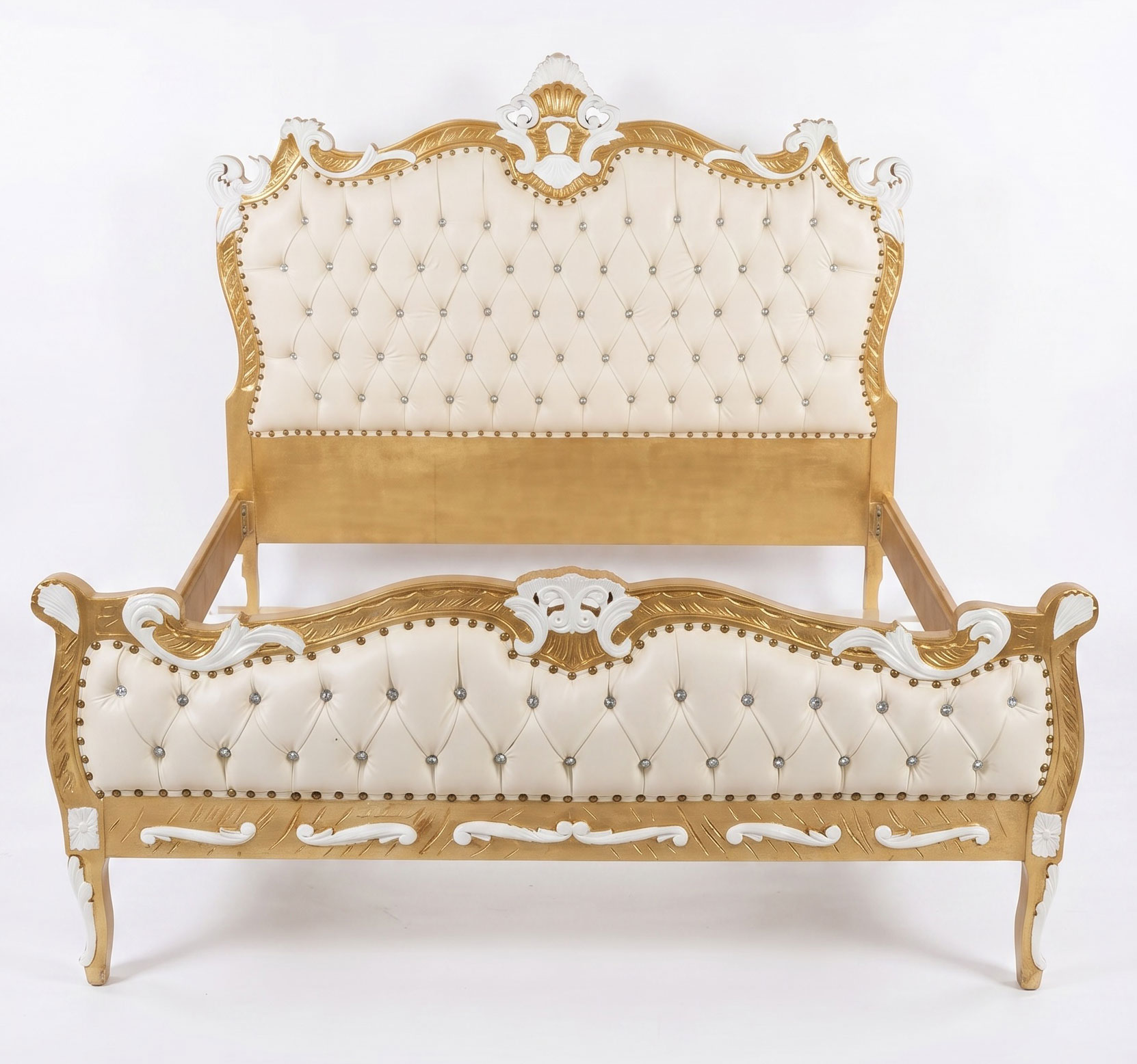 Der Rahmen ist aus Holz gefertigt und in aufwendiger Handarbeit veredelt. Die fein bemalte Oberfläche verleiht jedem Exemplar eine individuelle Ausstrahlung und unterstreicht den authentischen Charakter dieses außergewöhnlichen Möbelstücks. Die weich gepolsterten Flächen an Kopf- und Fußteil sind mit Stoff bespannt und sorgen für eine edle, harmonische Optik, die den klassischen Barockstil perfekt widerspiegelt.