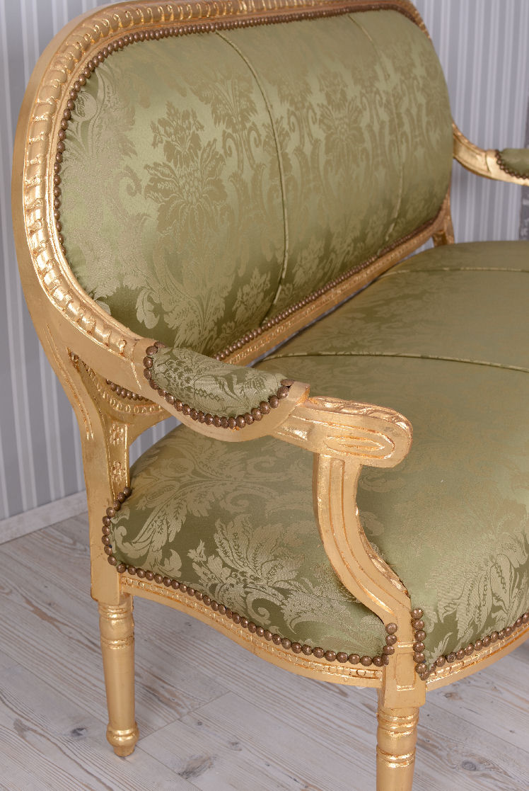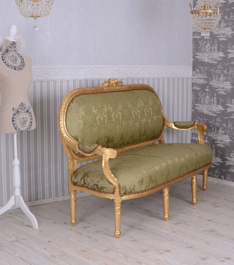 Die barocke Sitzbank „Madame Pompadour“ mit grünem Polsterbezug und goldenem Gestell ist eine besonders ausdrucksstarke und luxuriöse Interpretation des klassischen Rokoko-Stils.