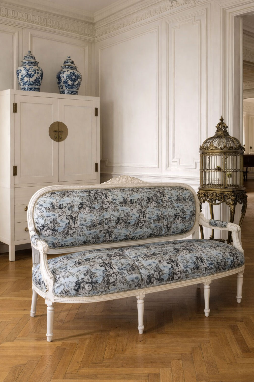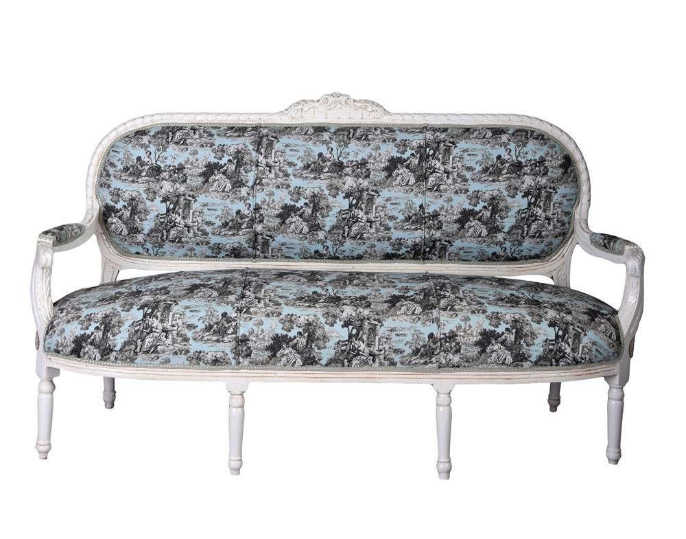 Das ikonische Toile-de-Jouy Muster, ursprünglich im 18. Jahrhundert in Frankreich entstanden, verleiht diesem Salon-Sofa eine authentische historische Ausstrahlung und verbindet höfische Leichtigkeit mit zeitloser Eleganz.