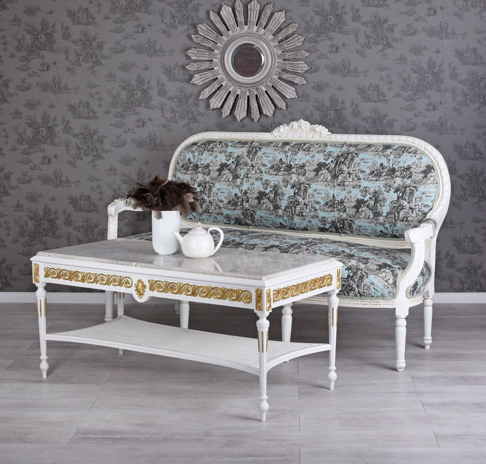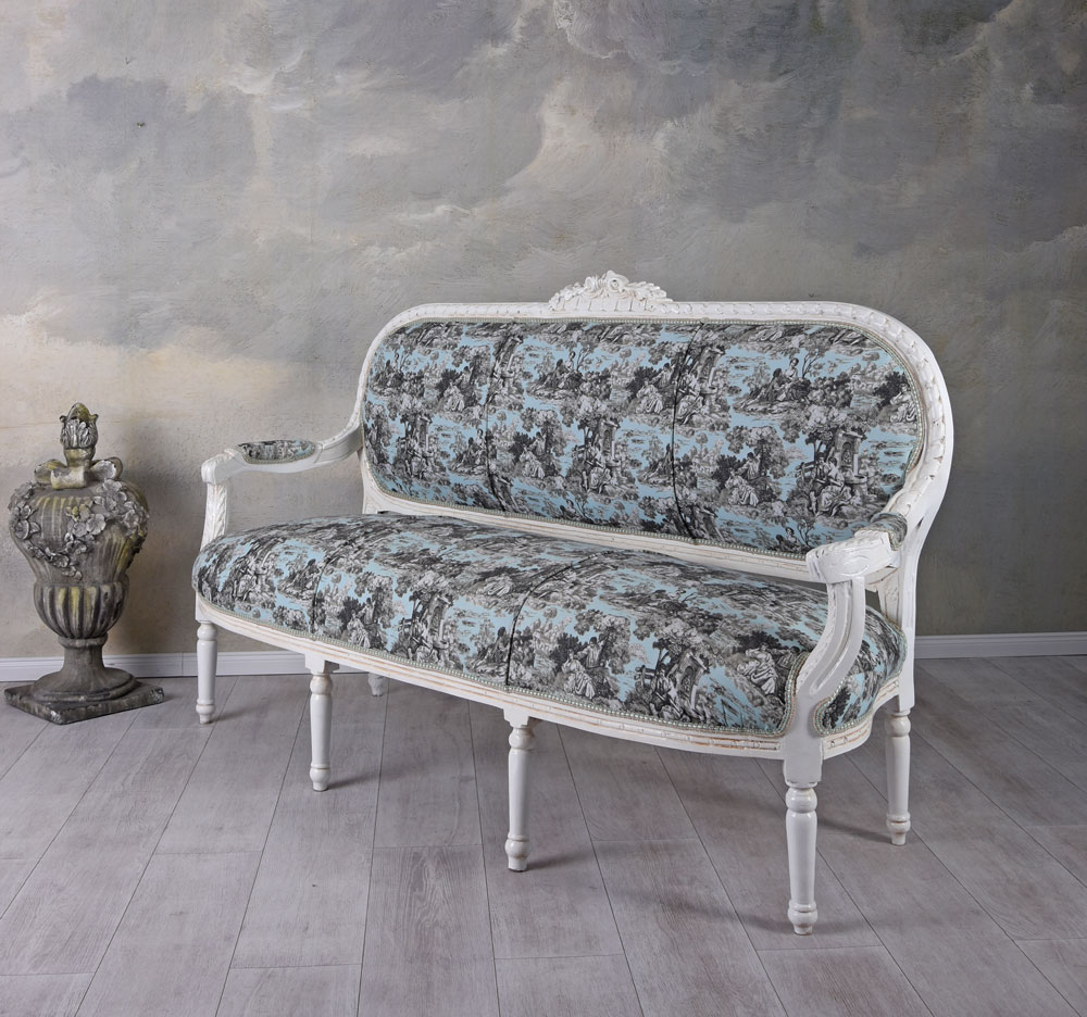 Die barocke Sitzbank „Madame Pompadour“ mit weißem Holzgestell und blau-weißem Toile-de-Jouy Bezug ist eine besonders elegante Hommage an den klassischen französischen Rokoko-Stil.