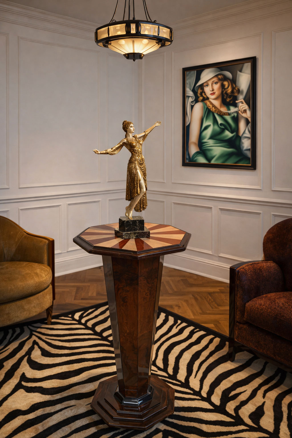 Der Beistelltisch „Bauhaus Villa“ vereint edle Intarsienarbeit und Art-Deco-Glamour zu einem stilvollen Statement-Piece – perfekt als elegante Blumensäule oder Sockel für besondere Lieblingsstücke.