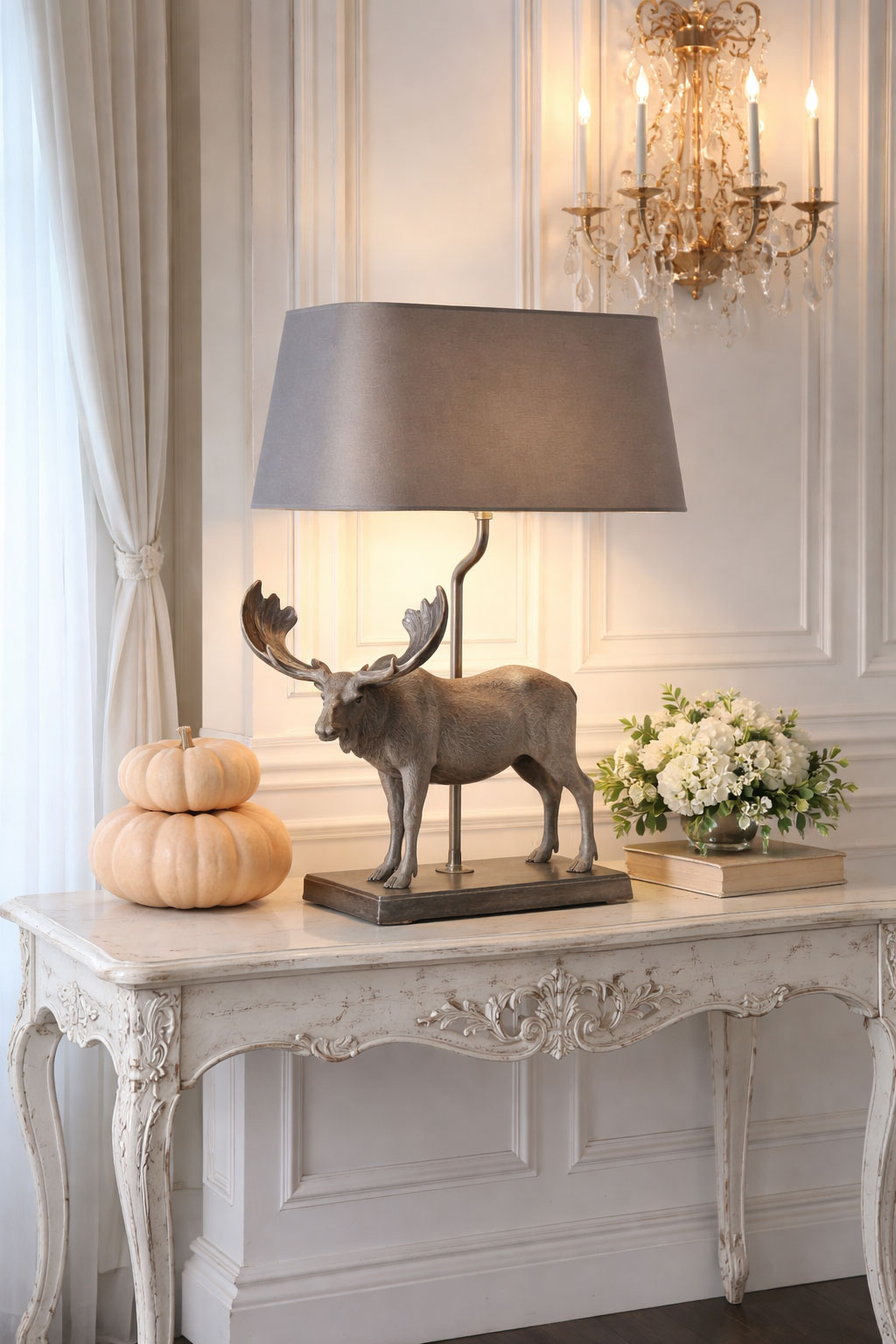 Der schlichte Stoff-Lampenschirm sorgt für ein angenehm warmes, diffuses Licht und bildet einen harmonischen Kontrast zur markanten Tierfigur. Diese Kombination macht die Tischlampe zu einem vielseitigen Wohnaccessoire – ideal für Wohnzimmer, Schlafzimmer, Flur oder als stilvolle Ergänzung in einer Chalet- oder Landhauseinrichtung.