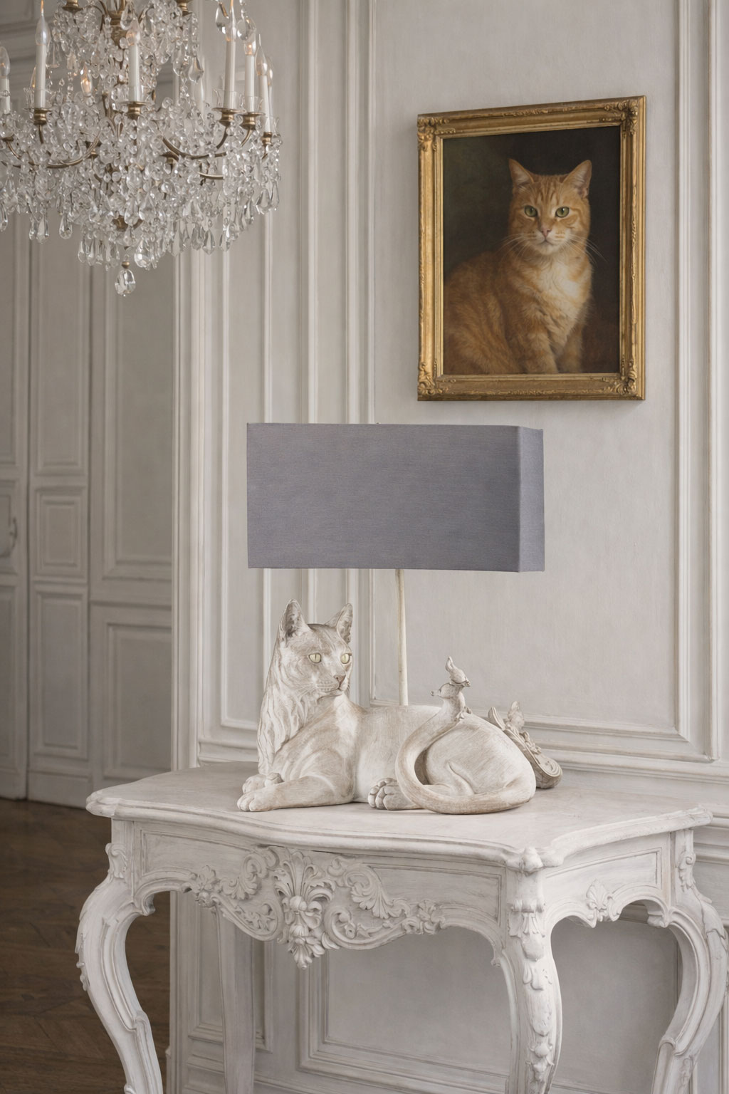 Die Katzenlampe „Villa Victoria“ ist eine dekorative Tischleuchte im romantischen Landhausstil und vereint liebevolle Gestaltung mit funktionaler Beleuchtung.