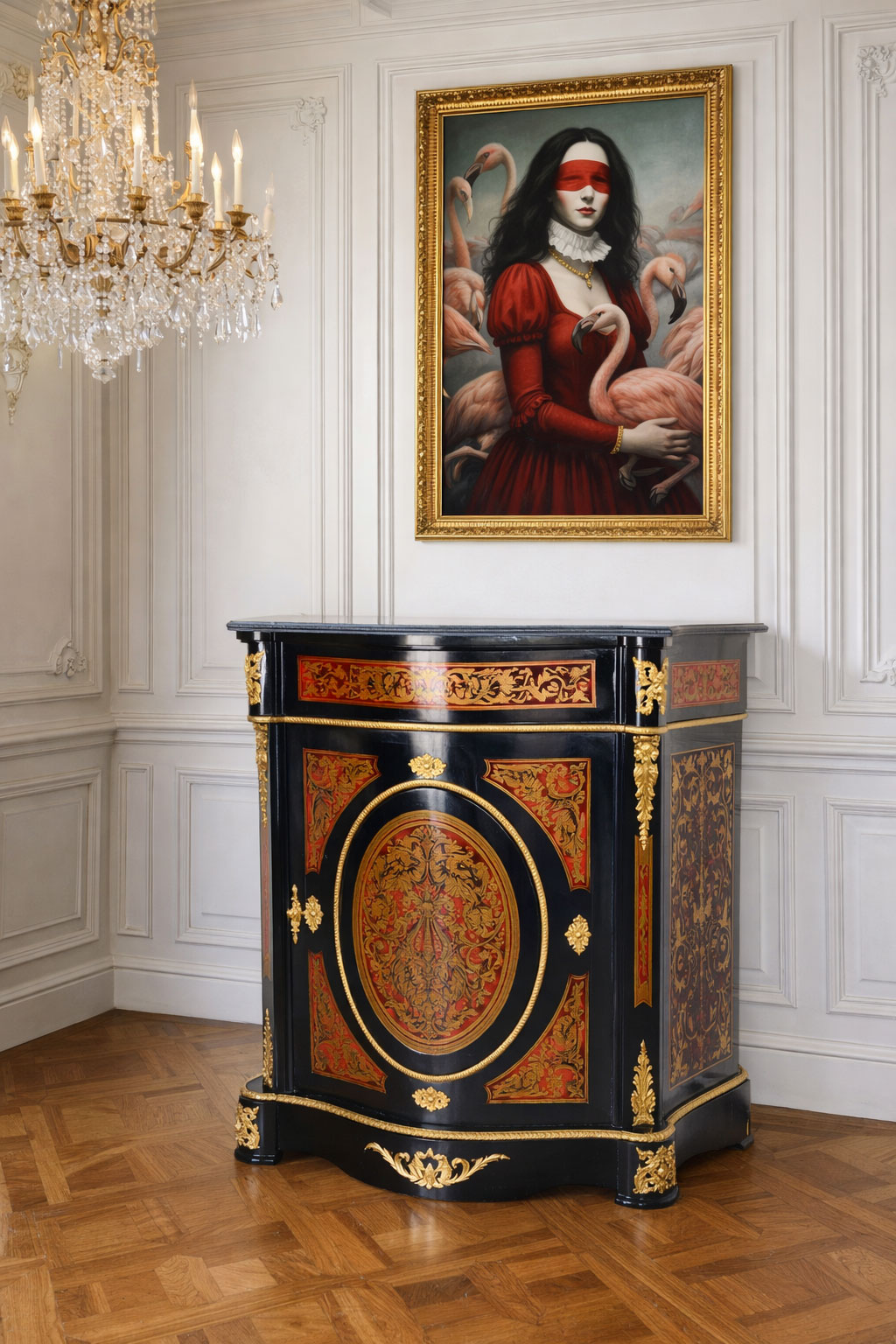 Gefertigt aus massivem Holz und aufwendig kunstvoll bemalt, besticht die Anrichte durch ihre detailreiche Gestaltung und edle Ausstrahlung. Die charakteristischen Boulle-Elemente sowie die prachtvollen Messingbeschläge unterstreichen den historischen Stil und verleihen dem Möbelstück seinen unverwechselbaren, aristokratischen Charakter.