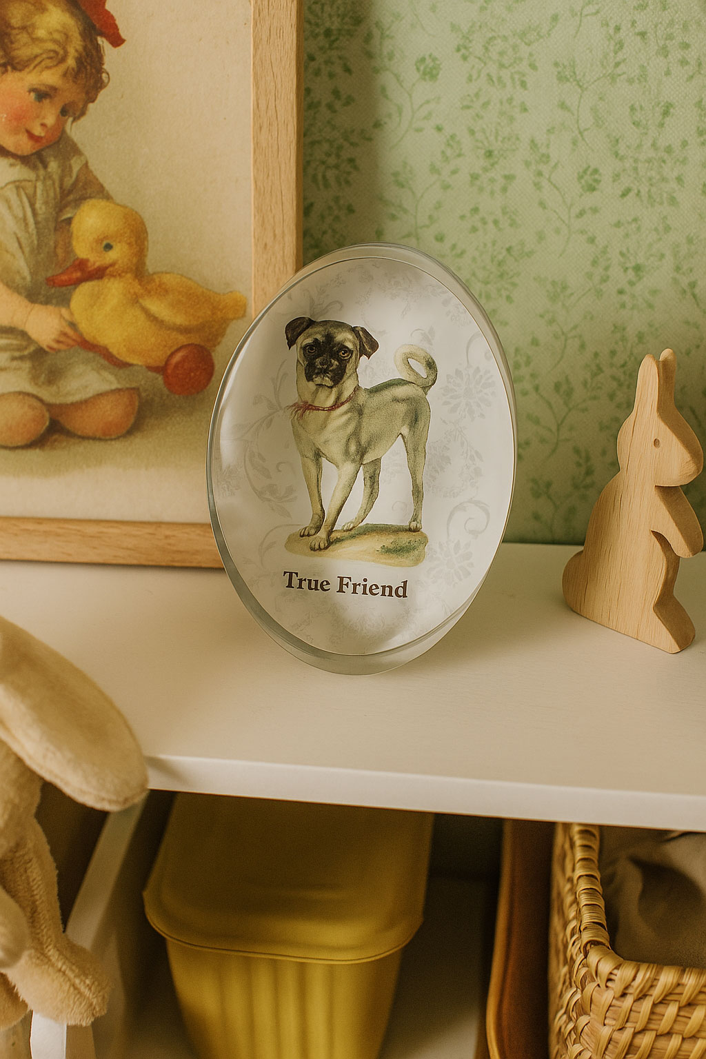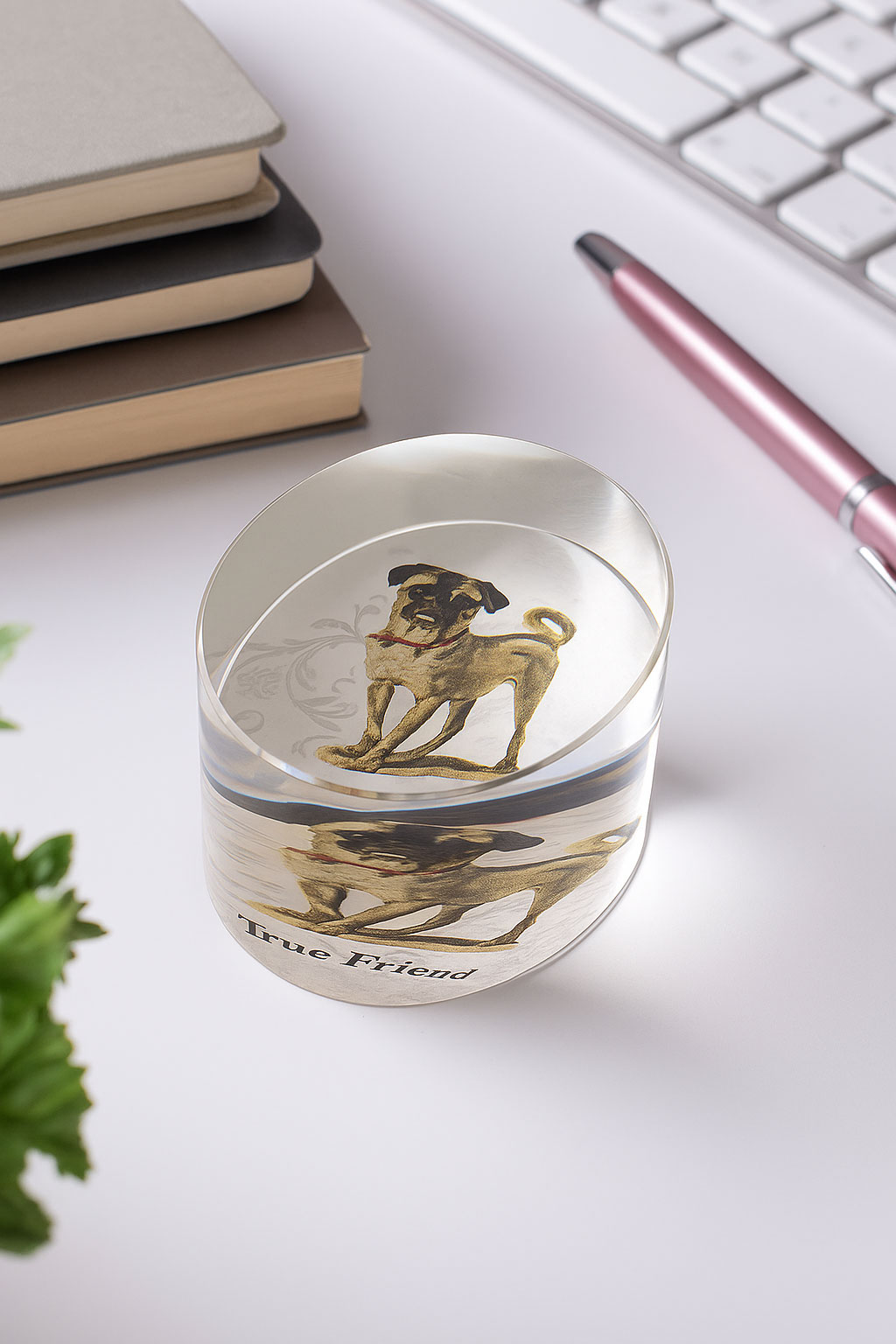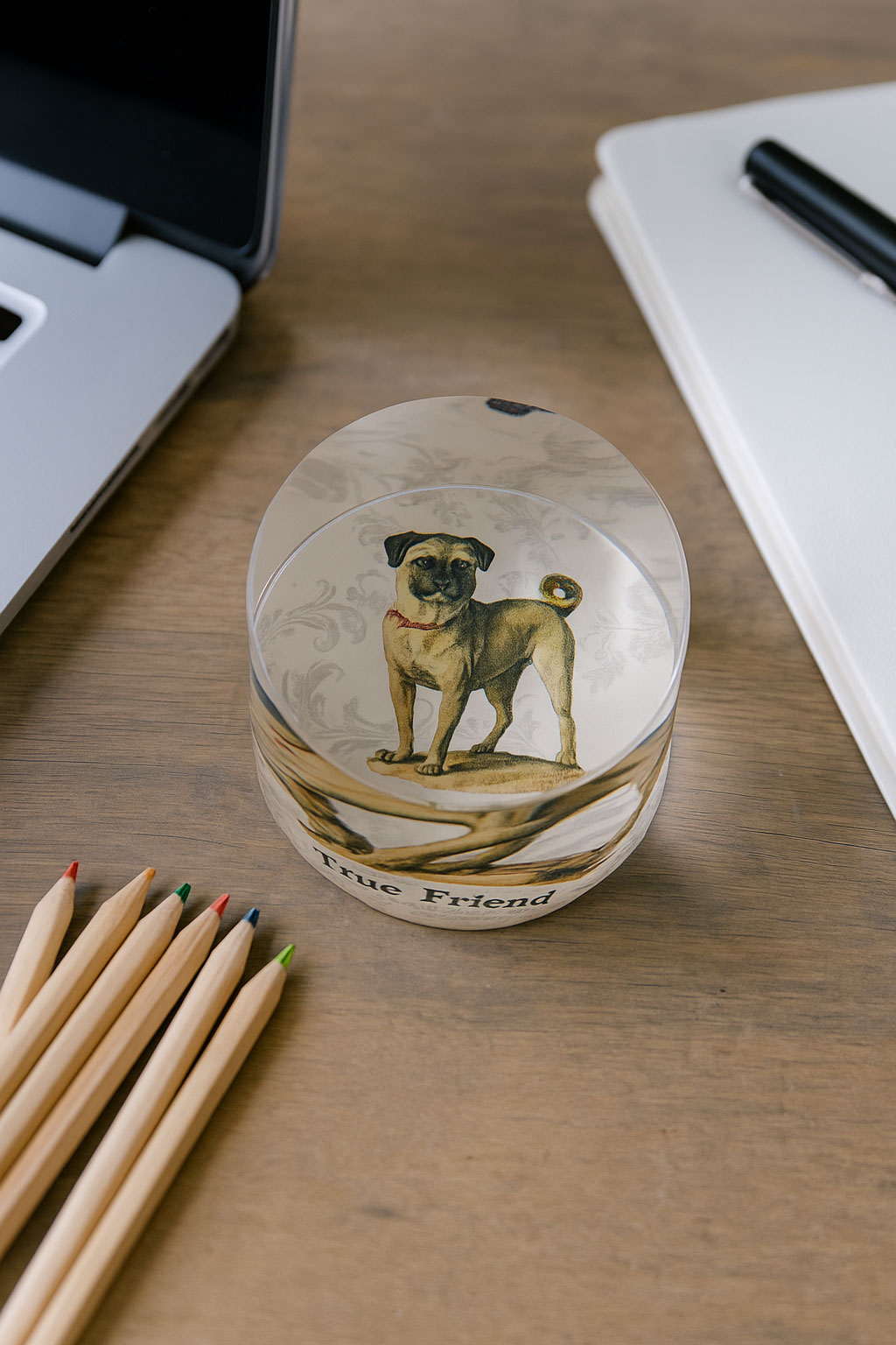 Dekorativer Briefbeschwerer „Retro Mops“ aus schwerem Acrylglas. Antik-Look mit nostalgischem Mops-Motiv – ein charmantes Accessoire für Schreibtisch & Büro.