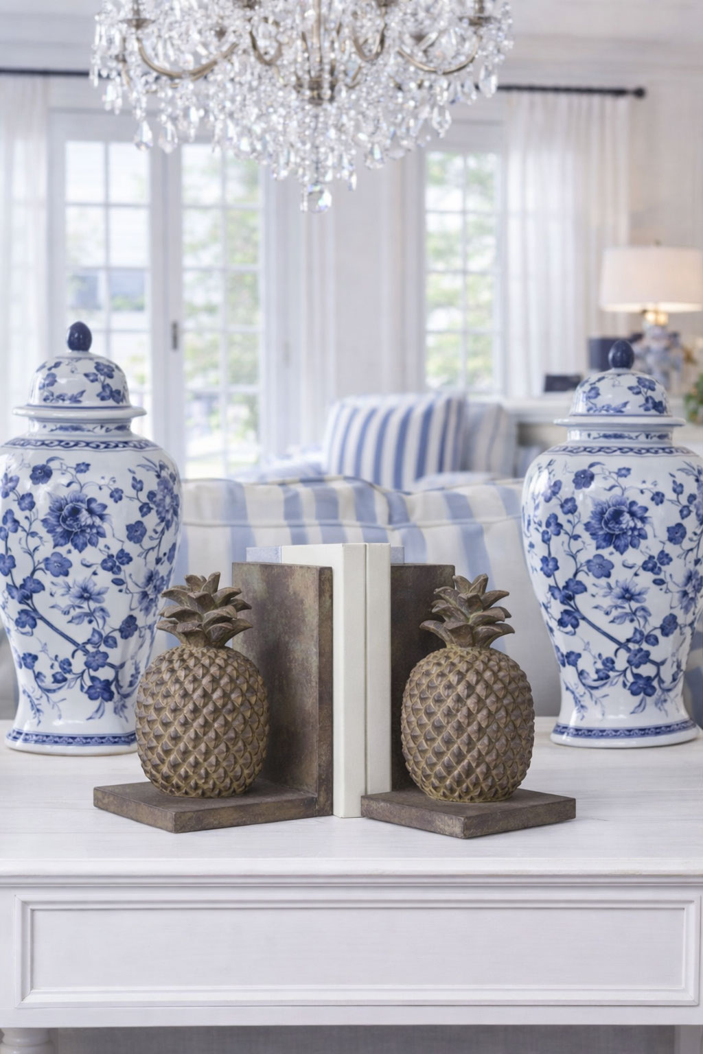 Die Buchstützen „Hemingway House“ vereinen dekorativen Vintage-Charme mit praktischer Funktion und setzen stilvolle Akzente in Ihrem Zuhause. Die beiden kunstvoll gestalteten Ananas-Figuren sind nicht nur funktionale Buchstützen, sondern zugleich ein ausdrucksstarkes Deko-Element mit exotischem Flair.