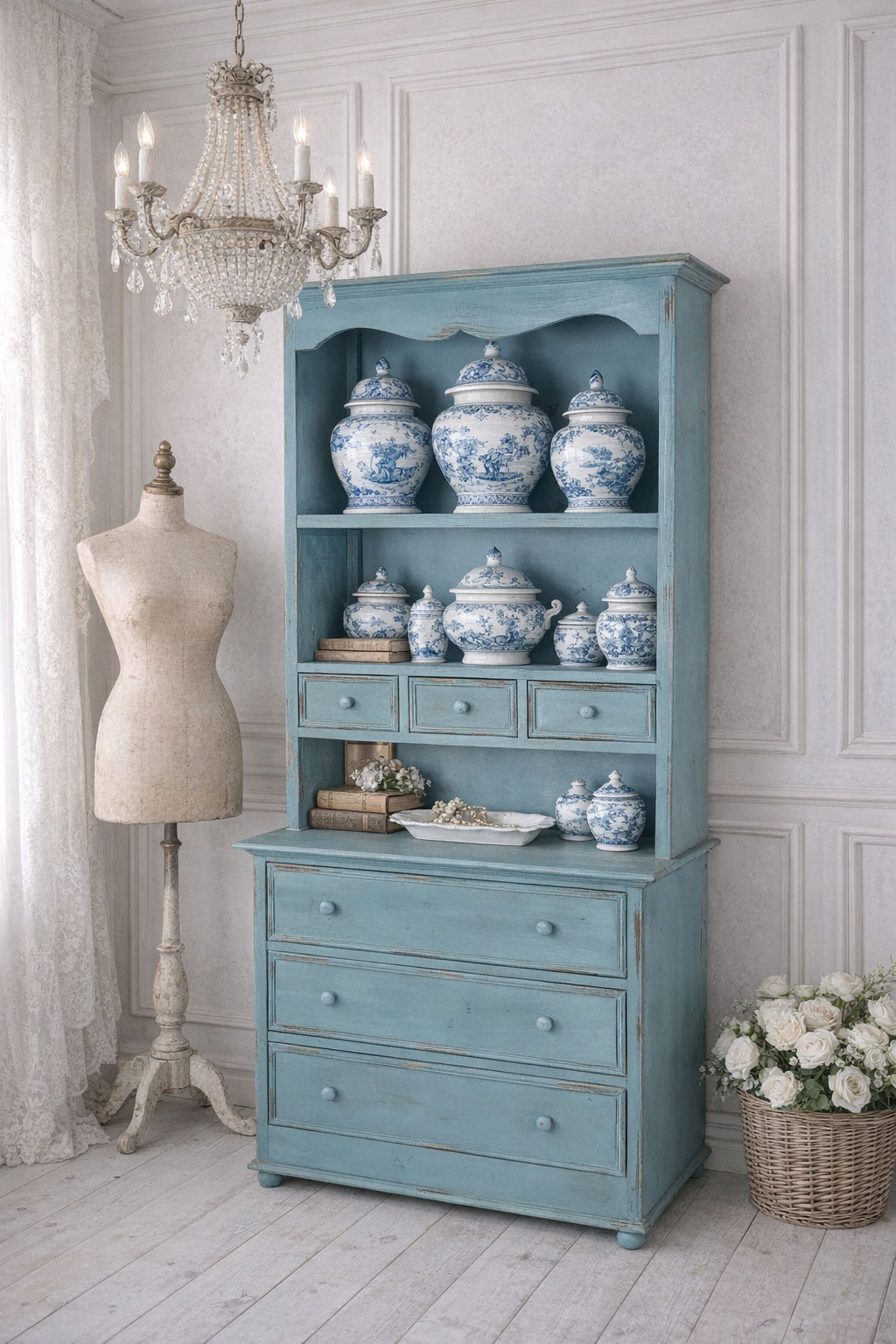 Mit seiner nostalgischen Ornamentik und der bewusst gealterten Oberfläche verkörpert dieses Möbelstück authentischen Shabby-Chic-Stil.