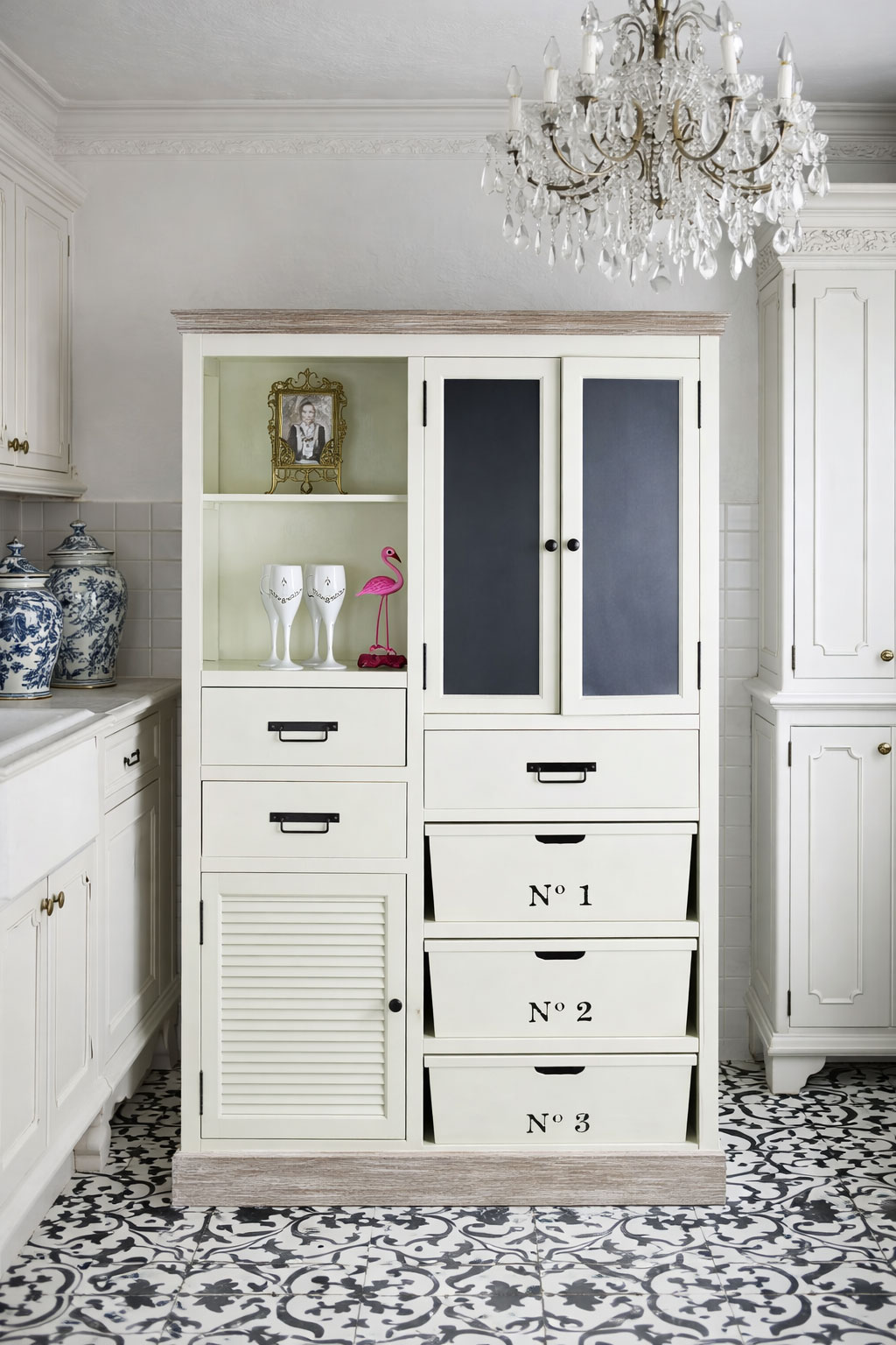 Besonders charmant sind die beiden Türen mit integrierten Kreidetafeln, die individuell beschriftet werden können und dem Schrank eine dekorative und zugleich praktische Note verleihen. Dadurch eignet sich das Möbelstück nicht nur als stilvolle Anrichte, sondern auch als funktionales Organisationsmöbel für Küche oder Esszimmer.