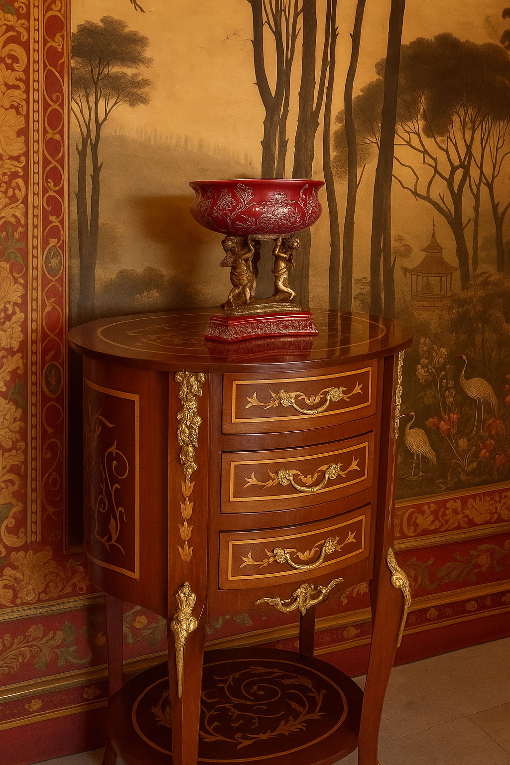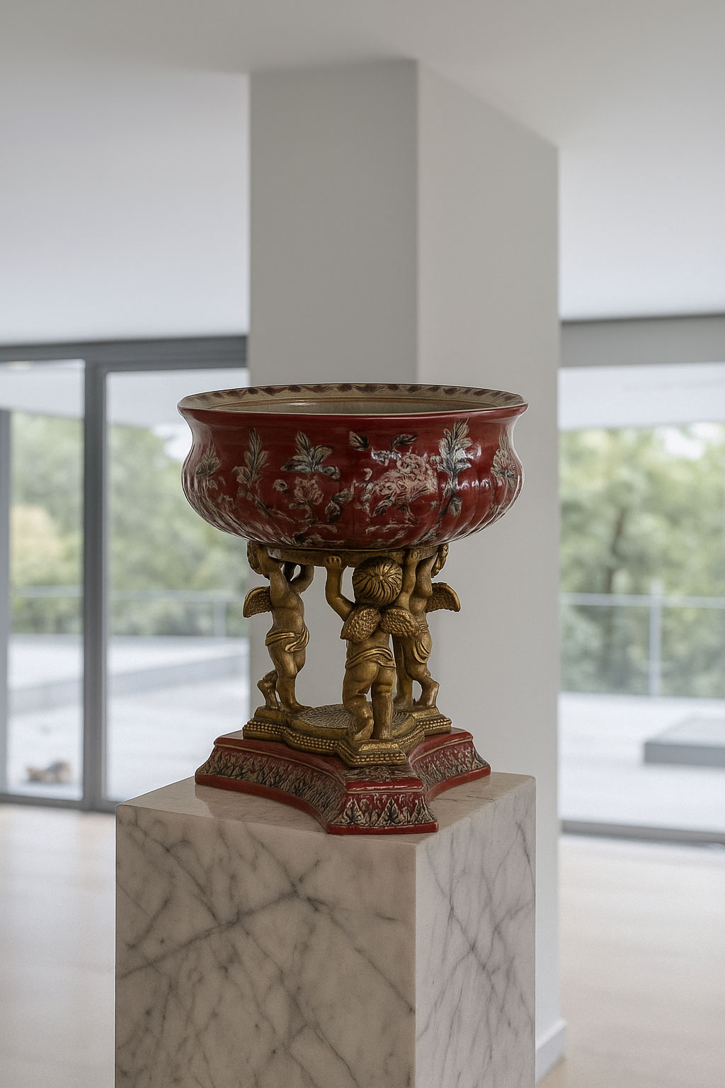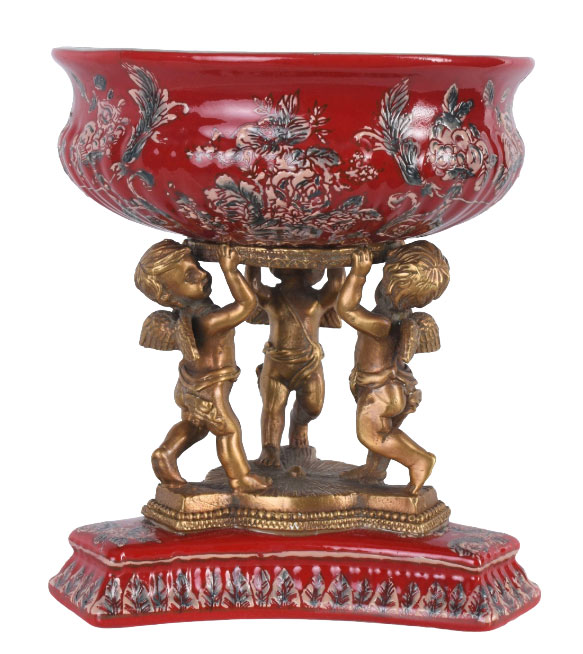 Auf einem kunstvoll gearbeiteten Bronzesockel ruht die Schale majestätisch – getragen von drei detailreichen Amoretten, die das Ensemble mit romantischer Leichtigkeit vollenden.
