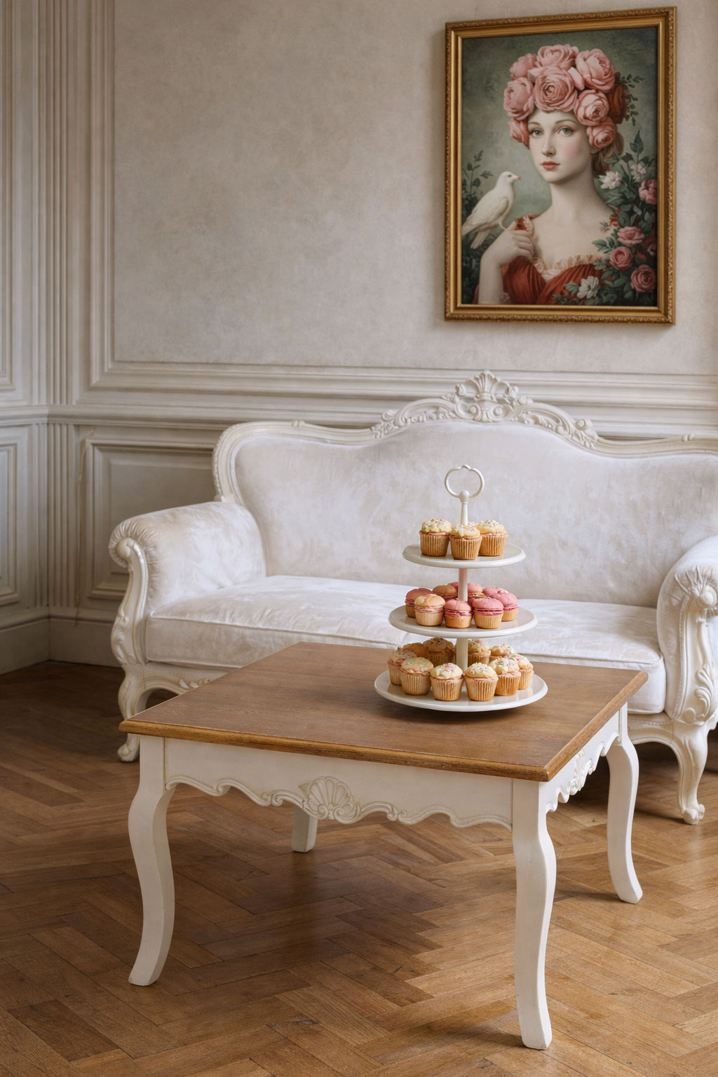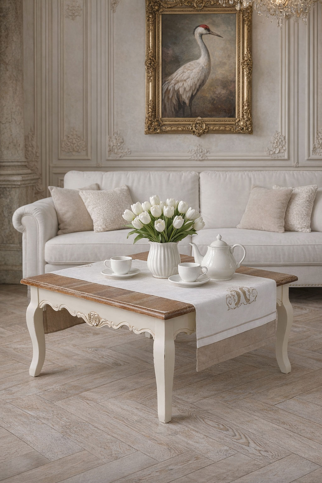 Der Couchtisch „Villa Isolde“ vereint geschwungene Formen, romantische Schnitzereien und Shabby Chic Patina zu einem charmanten Wohn-Highlight.