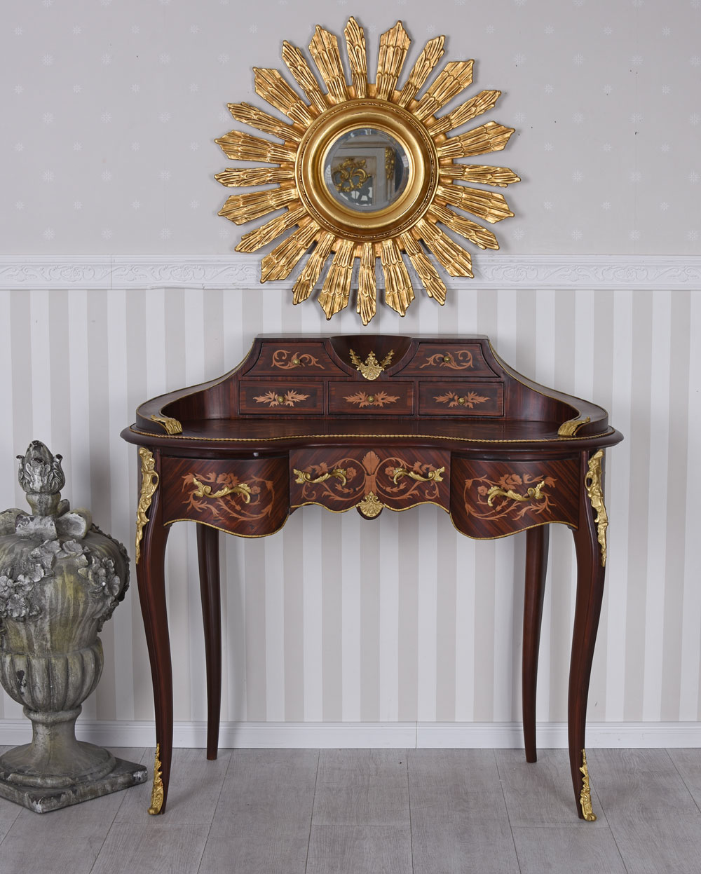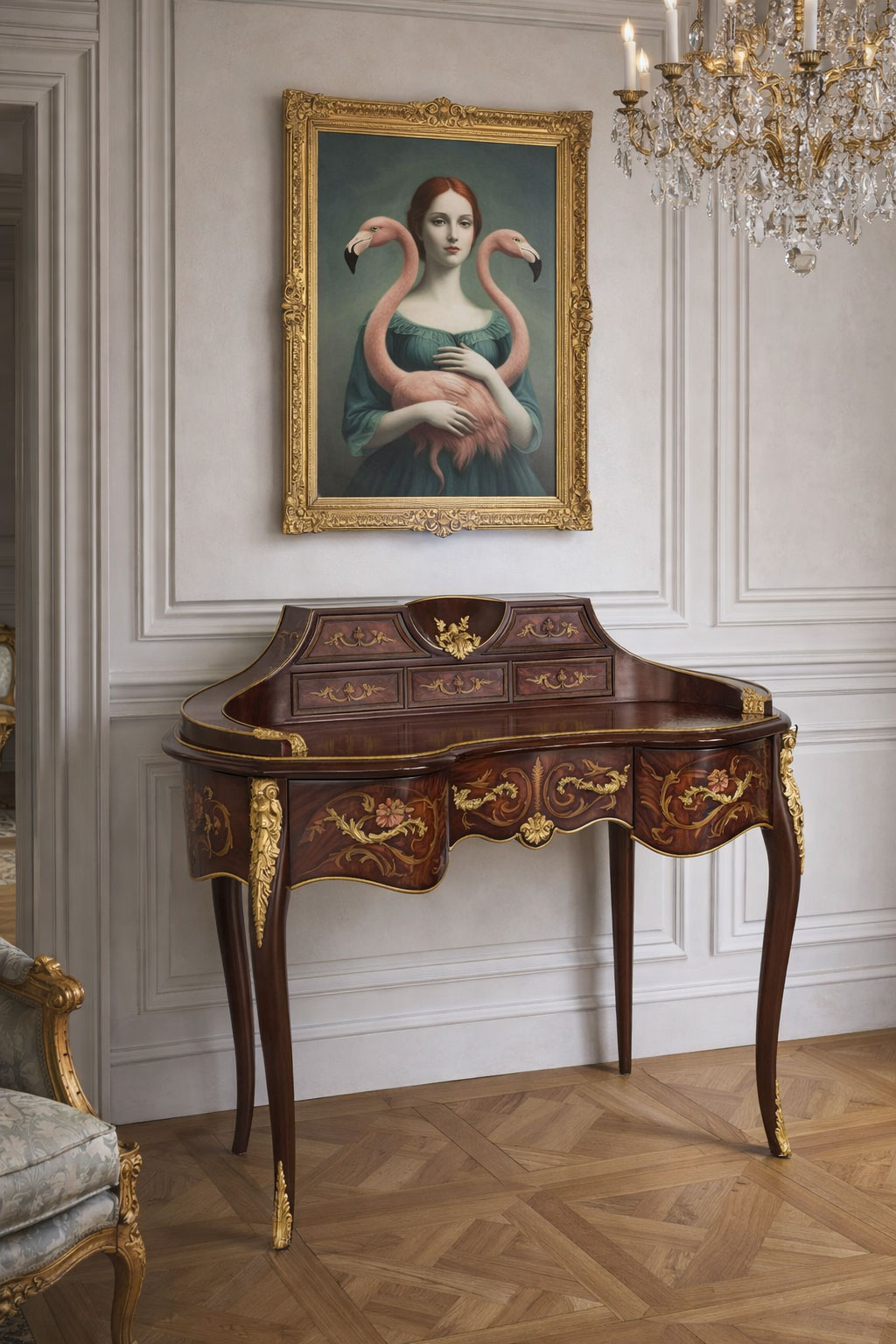 Der Damensekretär „Marquise de Pompadour“ vereint Rokoko-Opulenz, feine Intarsien und edle Messingdetails zu einem Meisterwerk französischer Möbelkunst. Ein handgefertigtes Unikat mit aristokratischem Charme und zeitloser Eleganz.