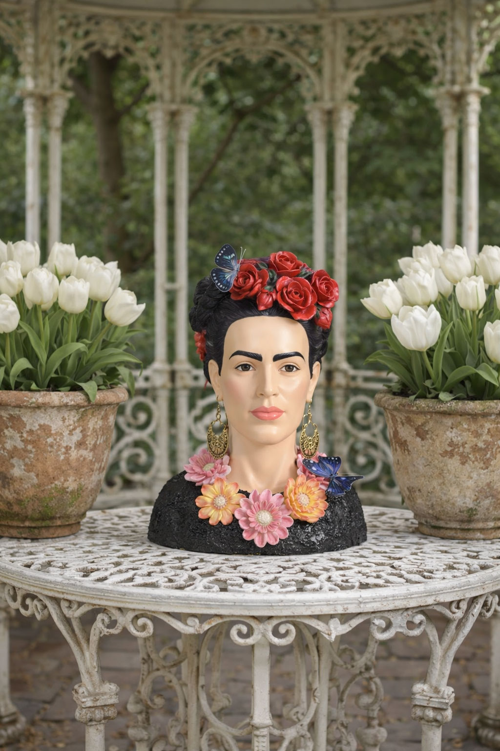 Die große Frida Kahlo Büste bringt Farbe, Kunst und sommerliche Lebensfreude in Ihr Zuhause. Mit Blumenkranz, Schmetterlingen und leuchtenden Details wird diese Skulptur zum ausdrucksstarken Statement-Piece mit Wow-Effekt.