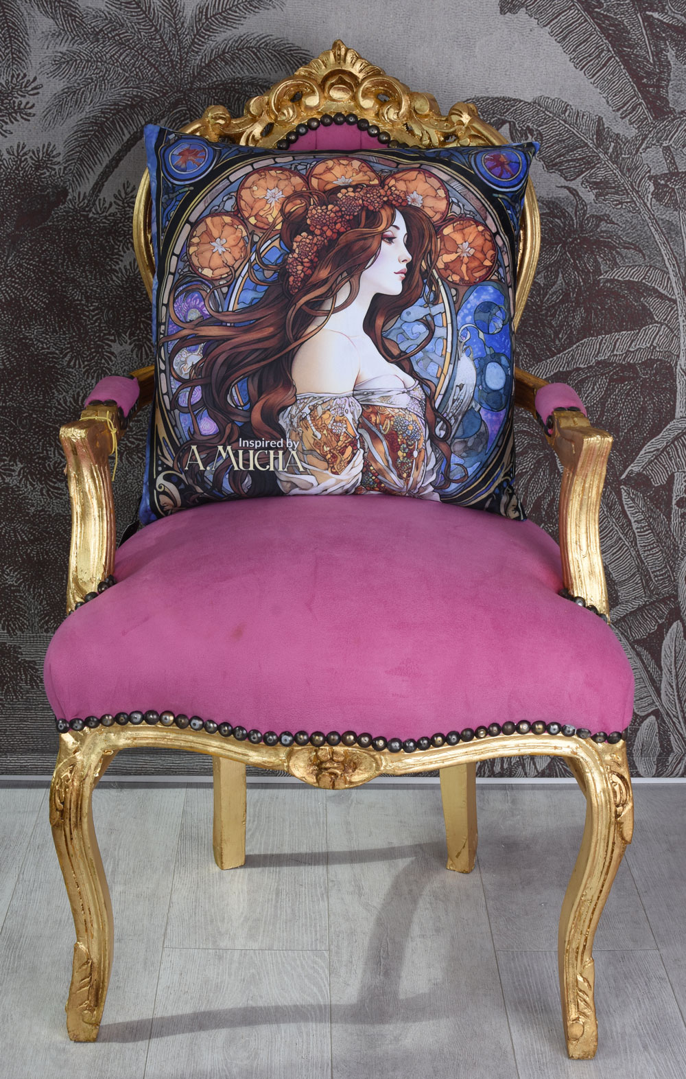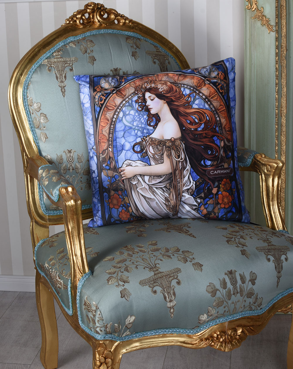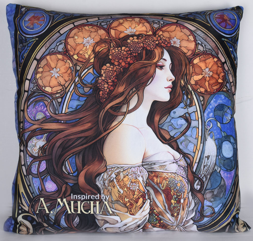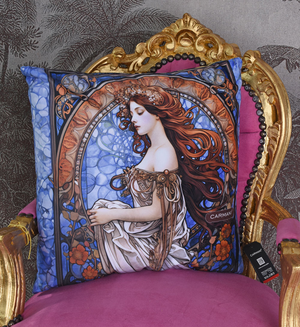Dieses dekorative Kissen ist eine stilvolle Hommage an die Epoche des Jugendstils und den berühmten Künstler Alfons Mucha, den Meister der Prager Secession.