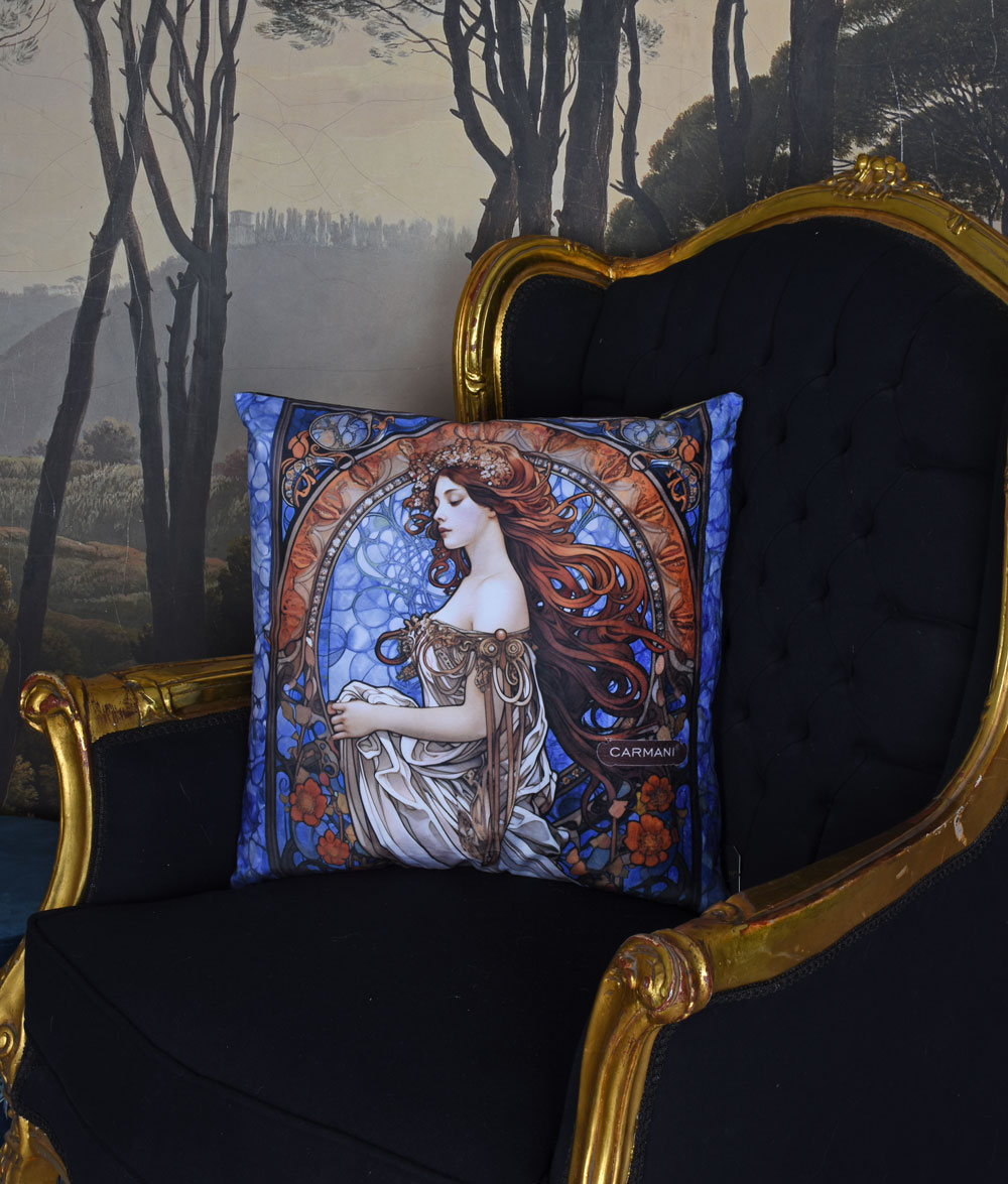 Edles Jugendstil-Kissen JUGENDSTIL VILLA mit Frauenporträt nach Alfons Mucha – beidseitig bedruckt, samtweich & inklusive Füllung.