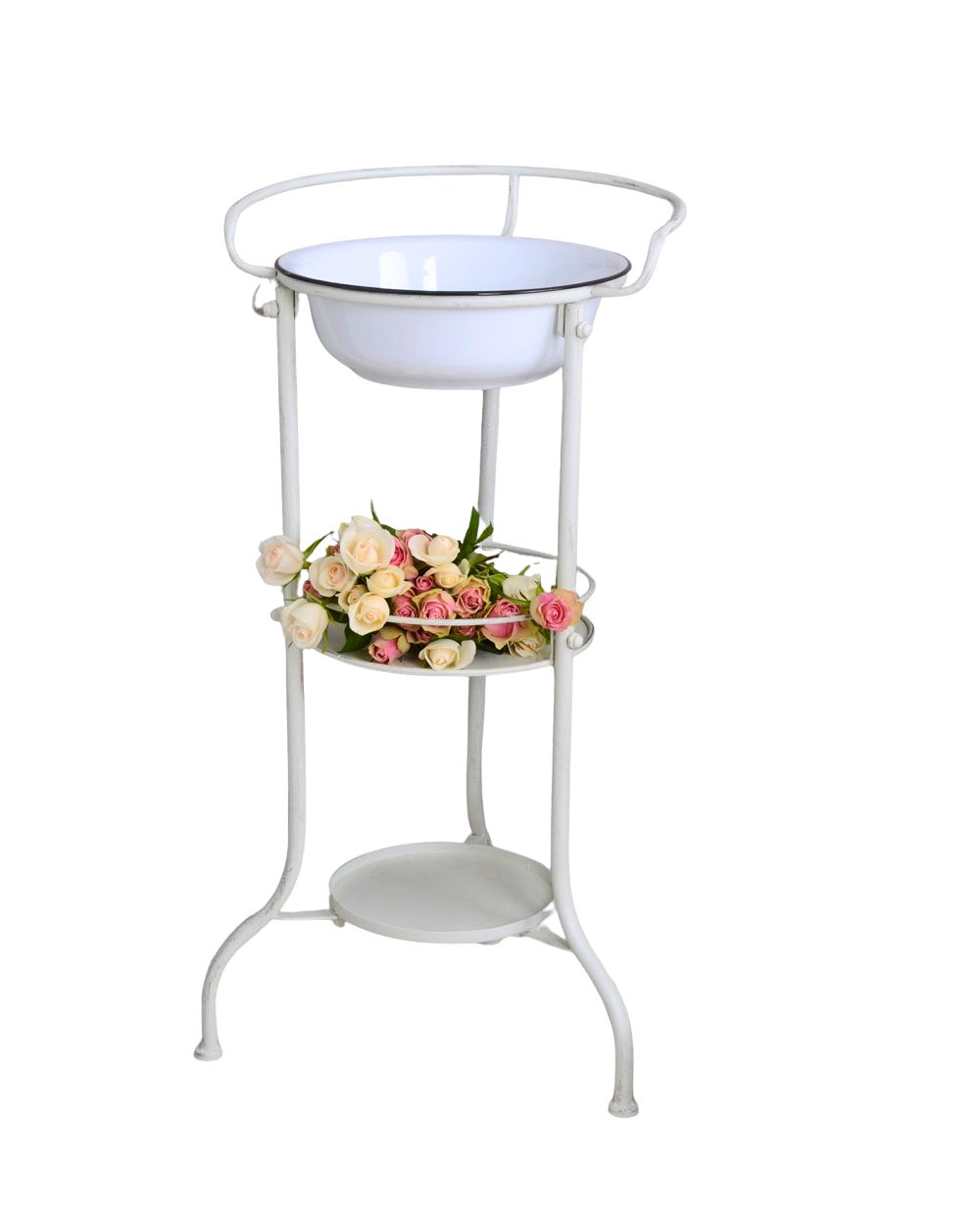 Der Waschtisch L´Hotel Paris ist eine nostalgische Dekorationsidee im französischen Landhausstil. Gefertigt aus bemaltem Metall in Weiß mit bewusst gesetztem Antik-Look, verzaubert er durch seine herausnehmbare Emaille-Schüssel und den unverwechselbaren Shabby Chic Charakter. Ein traumhaftes Vintage-Accessoire für Bad, Schlafzimmer oder Boutique-Dekoration. Höhe ca. 82 cm, Breite ca. 40 cm, Tiefe ca. 37 cm, Schüssel ø ca. 32 cm, Tiefe ca. 12 cm.
