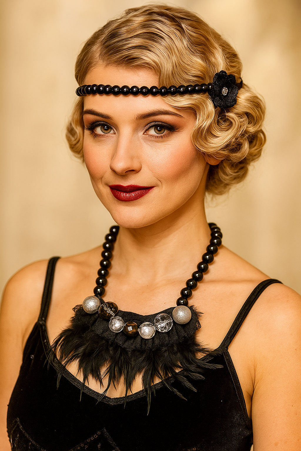 Extravagante Vintage Halskette „Villa Gatsby“ im Art Deco Stil. Schwarze Spitzenkette mit Perlen & echten Federn – romantisches Schmuckstück für festliche Outfits & als Geschenkidee.