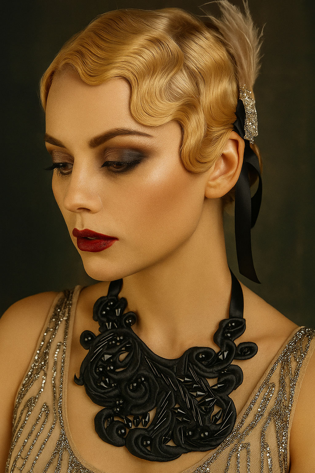 Anstelle eines klassischen Verschlusses wird die Halskette mit einer eleganten Schleife am Hals gebunden – ein Detail, das der „Femme Fatale“ ihren unverwechselbar nostalgischen Charakter verleiht.
