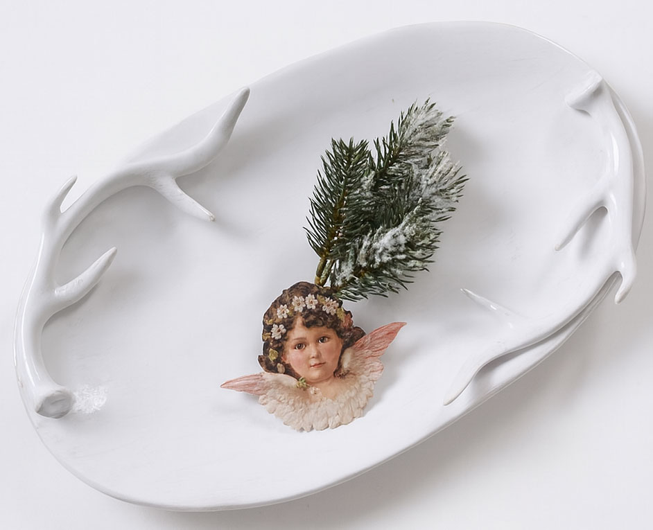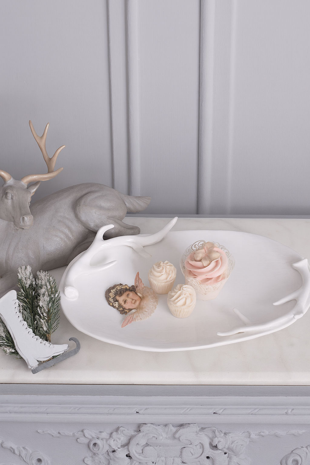 Große nostalgische Kuchenplatte aus altweißem Porzellan mit kunstvoller Geweih-Dekoration im Jagdhaus-Stil – ideal für festliche Tafeln und stilvolles Servieren. Länge ca. 38 cm / Breite ca. 22 cm / Höhe ca. 3,5 cm Lieferung erfolgt ohne Dekoration.