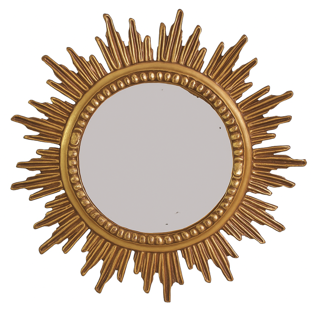 Der Sonnenspiegel „Palazzo Dario“ im Rokoko-Stil ist ein vergoldeter Wand- & Kaminspiegel aus Holz & Stuck. Mit Facettenschliff und Ø 70 cm (Spiegelfläche Ø 35 cm) – detailgetreue Reproduktion nach historischem Original.