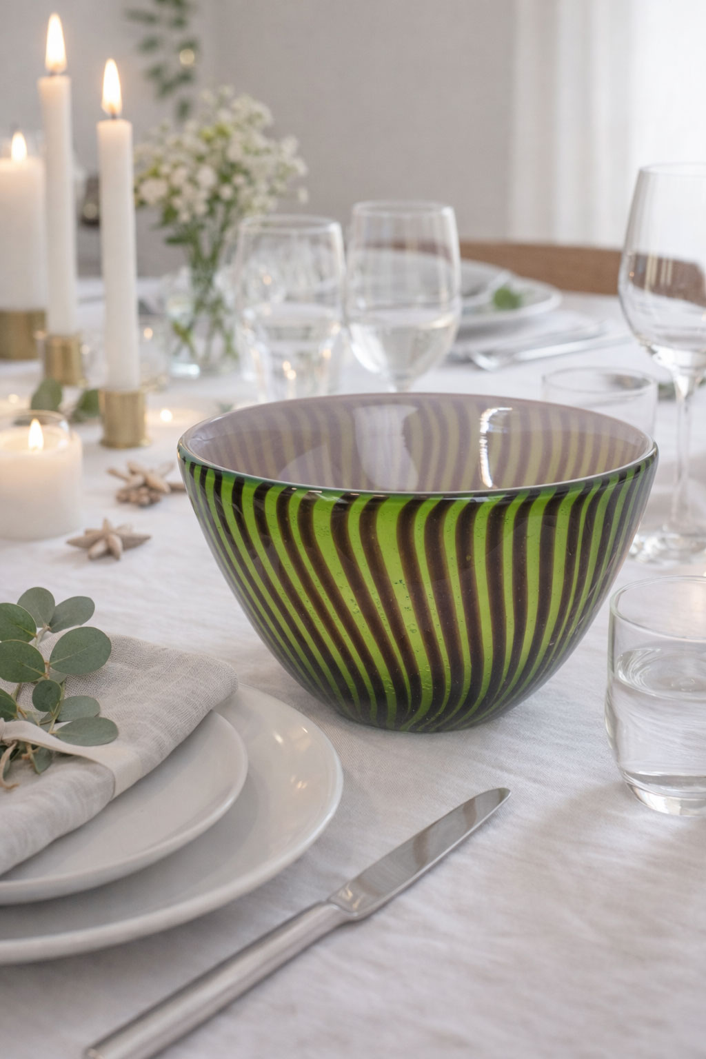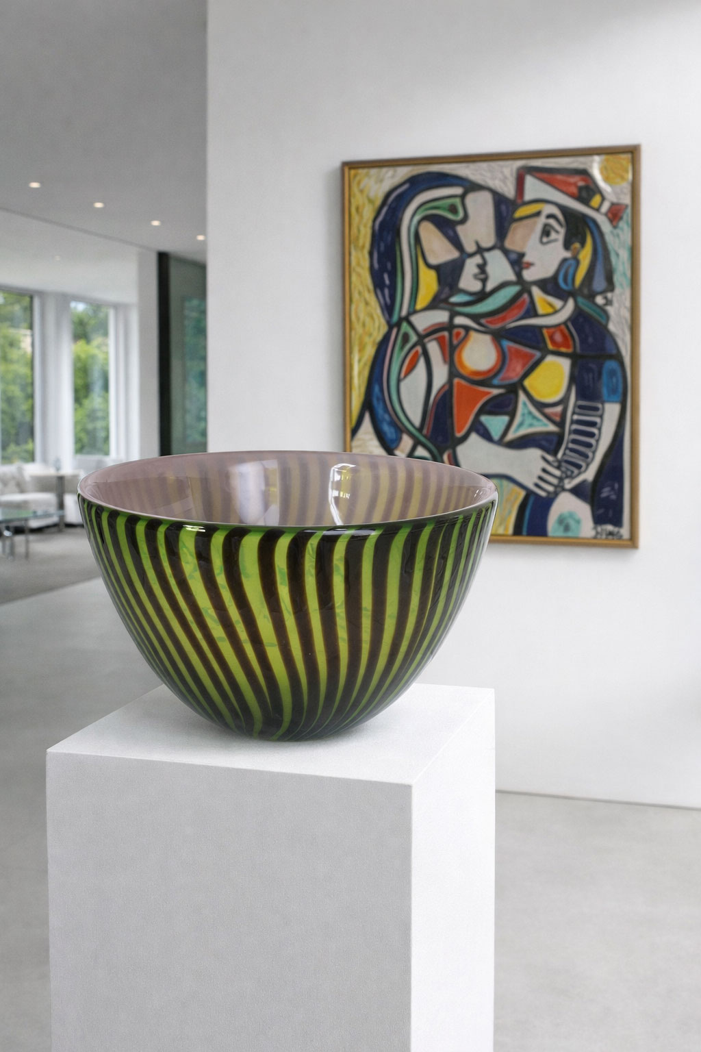 Diese Designer Glasschale im Murano-Stil ist ein ausdrucksstarkes Glasobjekt, das handwerkliche Perfektion mit künstlerischer Eleganz verbindet.