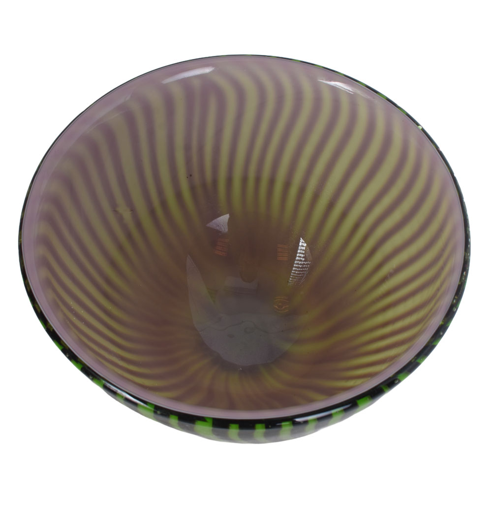Mit einem Durchmesser von etwa 43 cm und einer Höhe von ca. 14 cm besitzt die Glasschale eine außergewöhnliche Präsenz und eignet sich ideal als dekorative Obstschale, als zentrales Designobjekt auf einem Tisch oder als exklusives Sammlerstück in der Vitrine oder auf einer Säule.