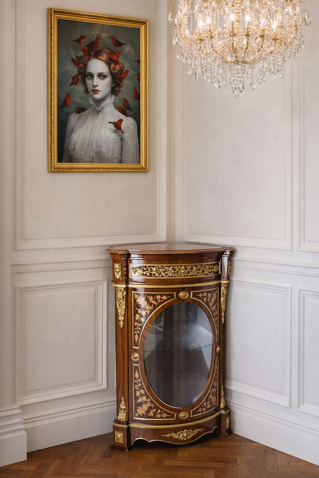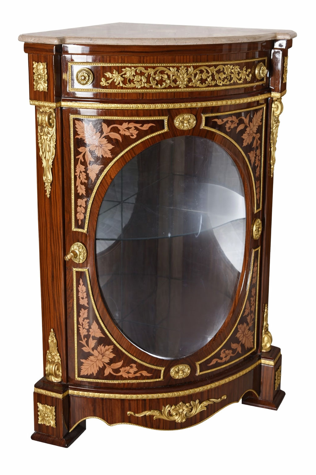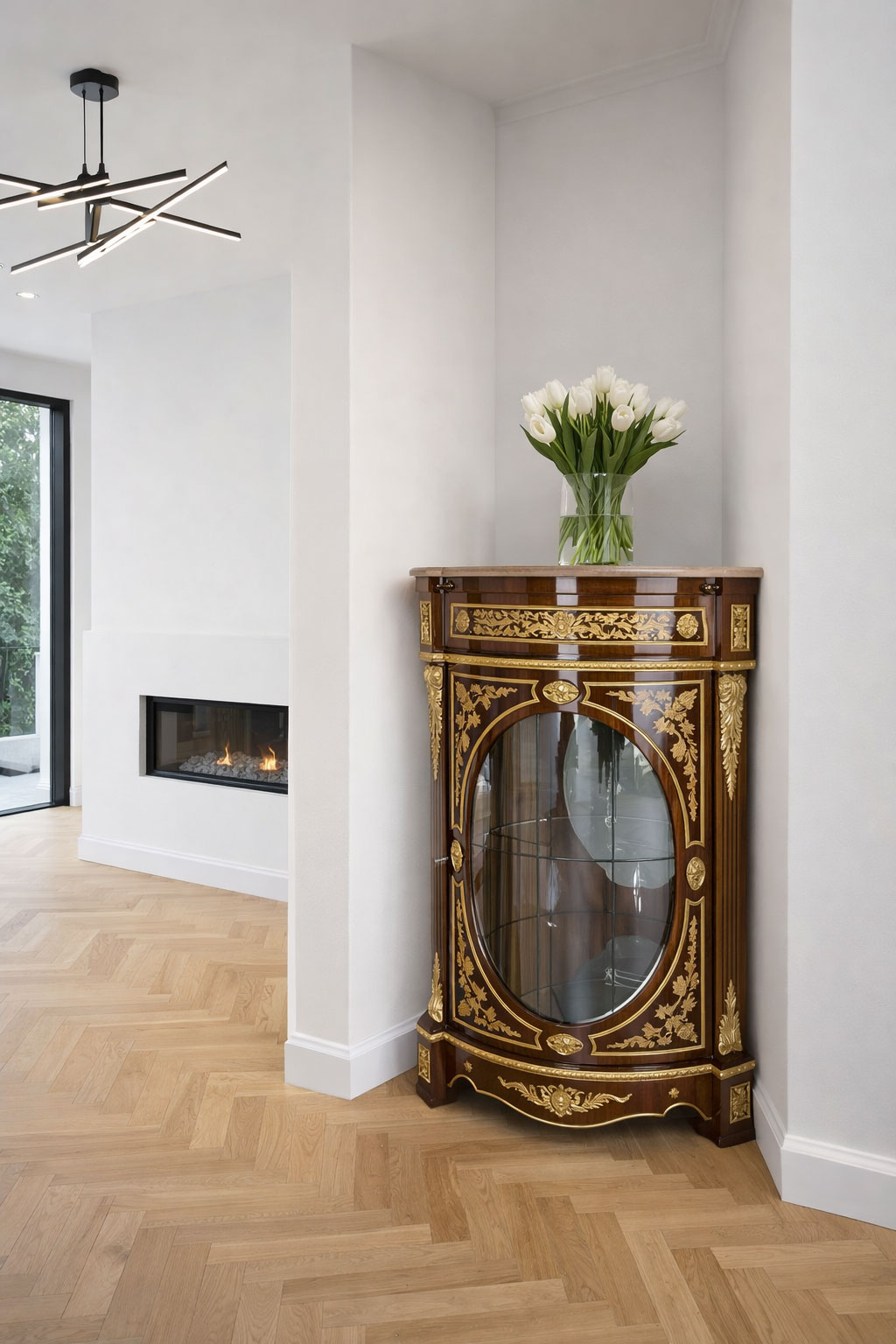 Diese elegante, halbrunde Eckvitrine wurde in aufwendiger Handarbeit nach historischem Vorbild gefertigt und vereint kunsthandwerkliche Raffinesse mit edler Materialwahl.