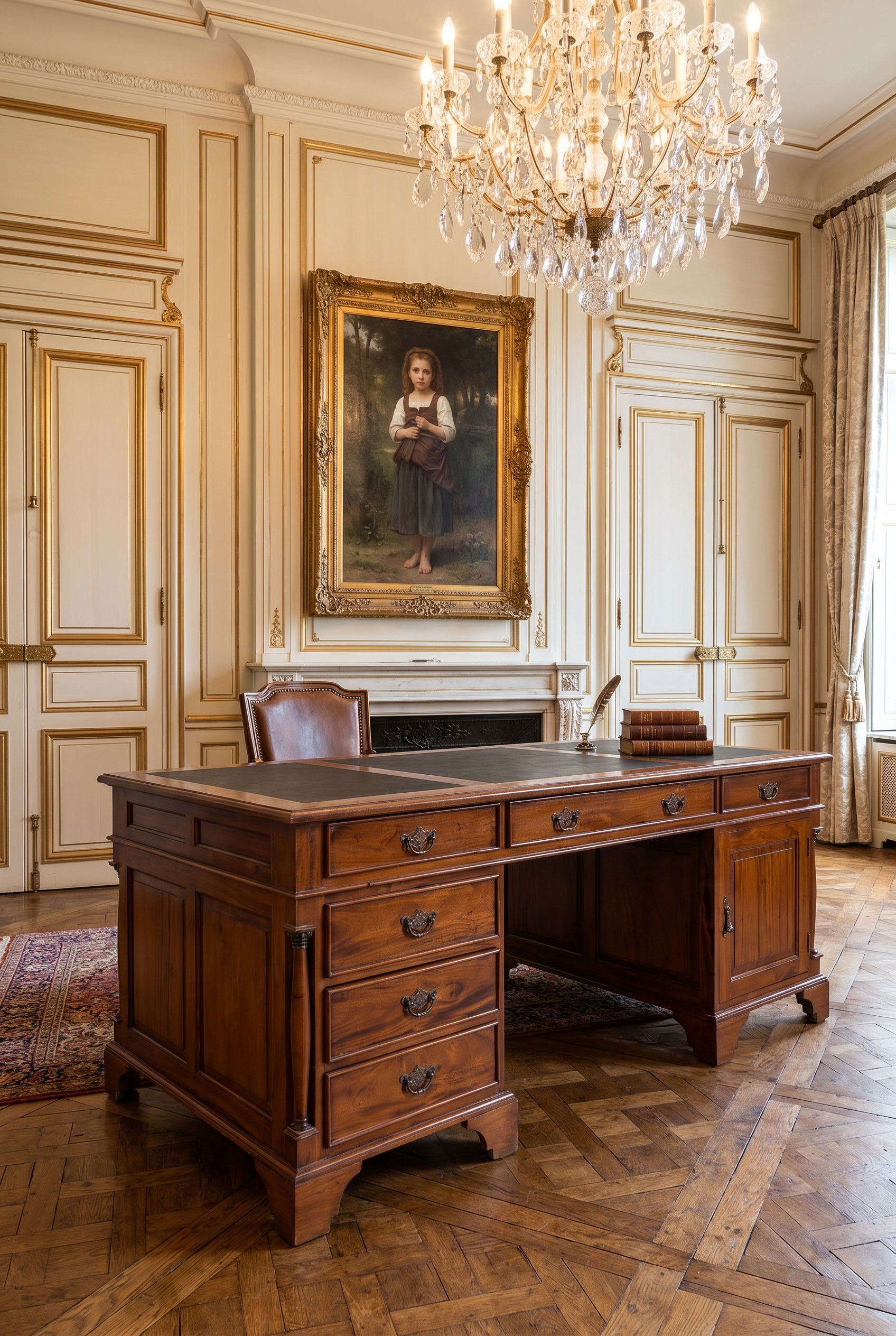 Dank seiner freistehenden Bauweise kann der Schreibtisch flexibel im Raum platziert werden und wirkt aus jeder Perspektive repräsentativ. Ob im Büro, im Arbeitszimmer oder in einer stilvollen Bibliothek – dieses Möbelstück wird zum zentralen Blickfang mit beeindruckender Präsenz.