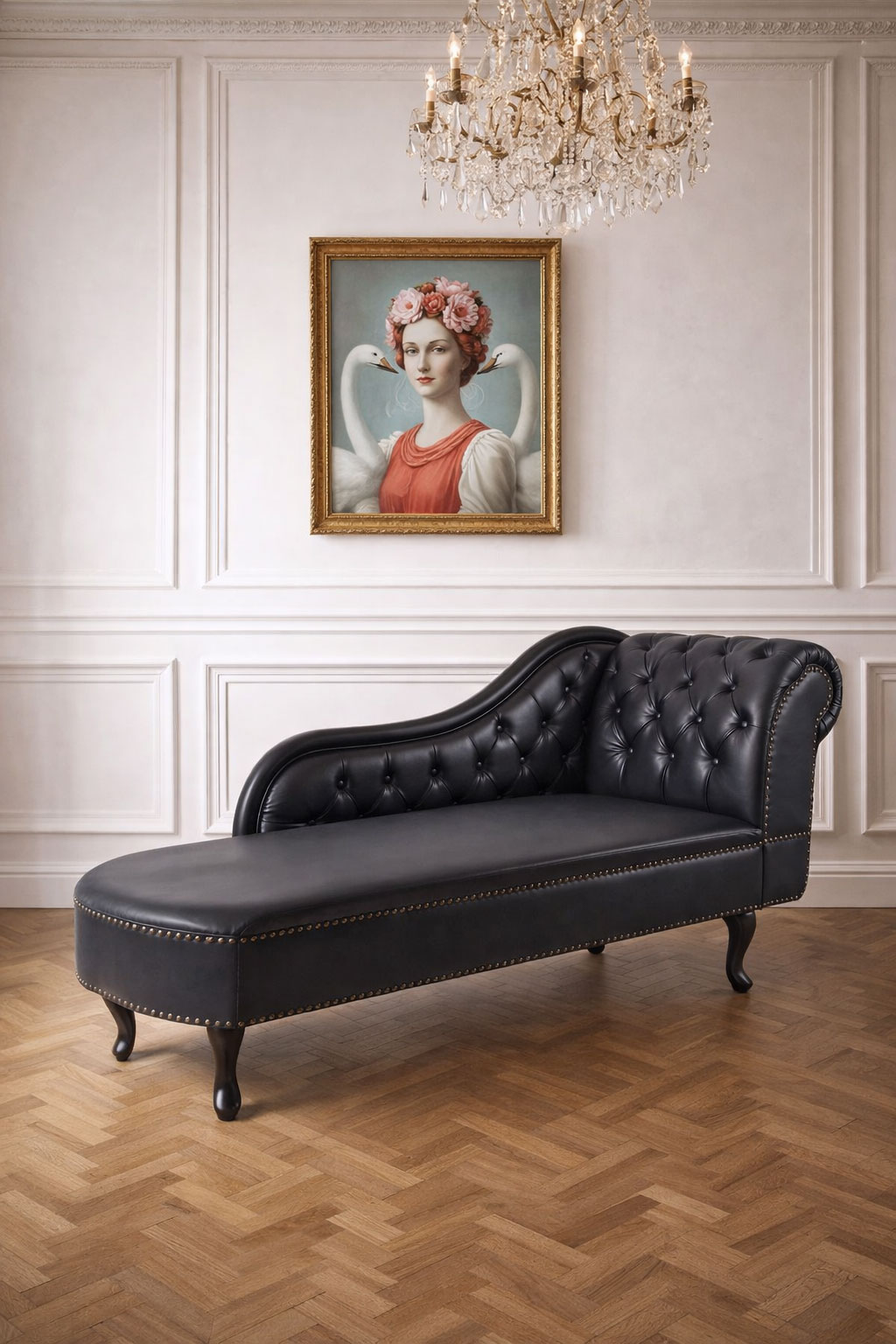 Die Recamiere „Baker Street 221 B“ bringt britischen Chesterfield-Charme in Ihr Zuhause. Geschwungene Formen, Lederoptik und edle Holzdetails machen sie zum stilvollen Lounge-Möbel mit klassischer Eleganz und hohem Komfort.