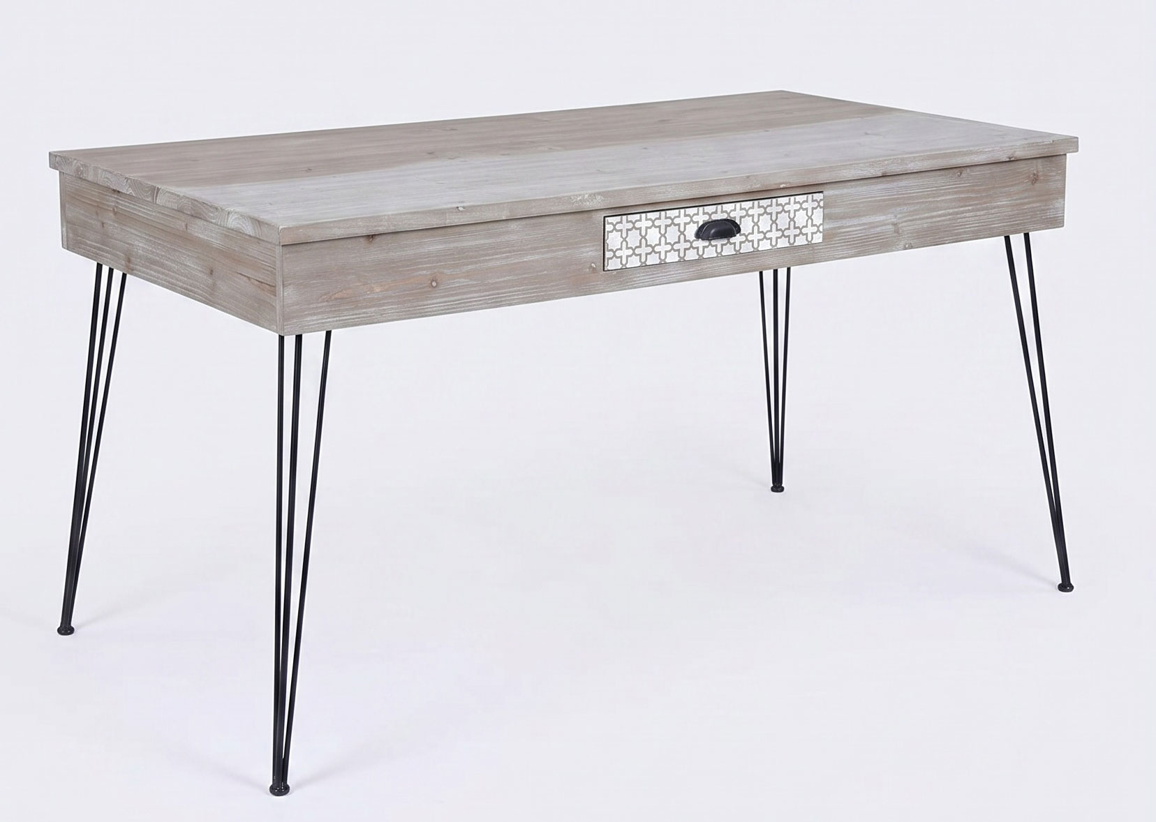 Die integrierten zwei Schubladen im schlichten Korpus bieten praktischen Stauraum für Besteck, Unterlagen oder Alltagsgegenstände und machen den Tisch besonders alltagstauglich. Die bewusst leicht gealterte Oberfläche verleiht ihm einen authentischen Vintage-Look und lässt ihn wie ein Möbelstück mit Geschichte wirken.