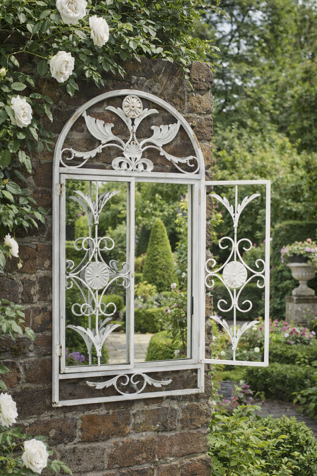 Auch im geschützten Außenbereich, beispielsweise auf einer Terrasse, Veranda oder im Garten, kann der Fensterspiegel als stilvolle Wanddekoration verwendet werden.