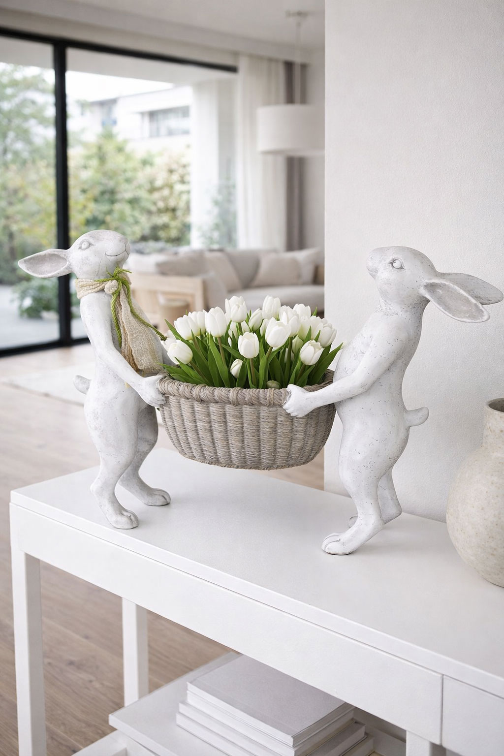 Zwei kunstvoll gestaltete Hasen tragen gemeinsam die Schale und verleihen dem Stück eine verspielte, zugleich elegante Ausstrahlung.