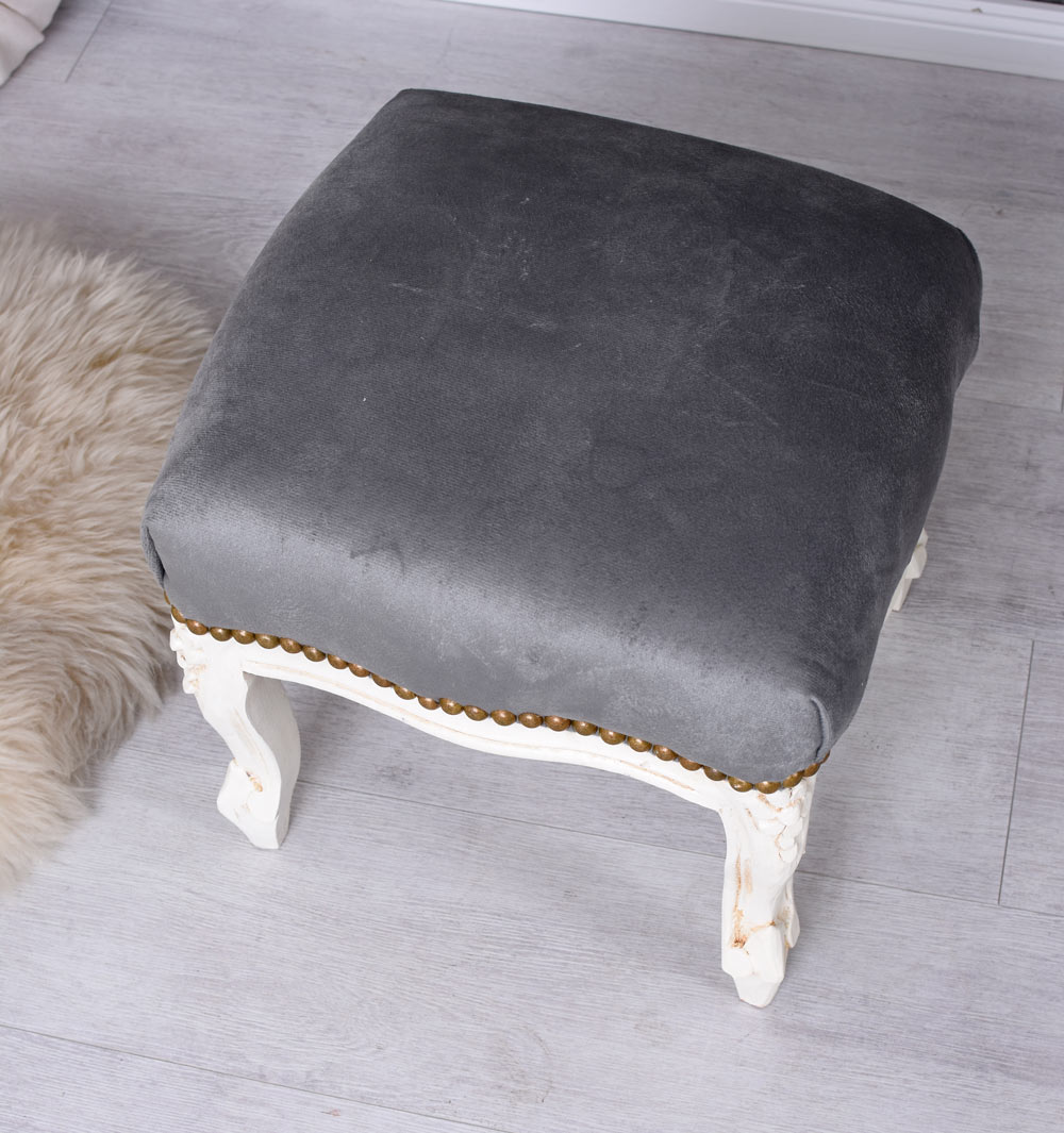Mit einer Höhe von ca. 32 cm, einer Breite von etwa 40 cm und einer Tiefe von rund 38 cm eignet sich das Fußbänkchen ideal als stilvoller Fußschemel, als Beistellhocker im Schlafzimmer oder als elegante Ergänzung zu Schminkkommode, Leseecke oder klassischem Sessel.