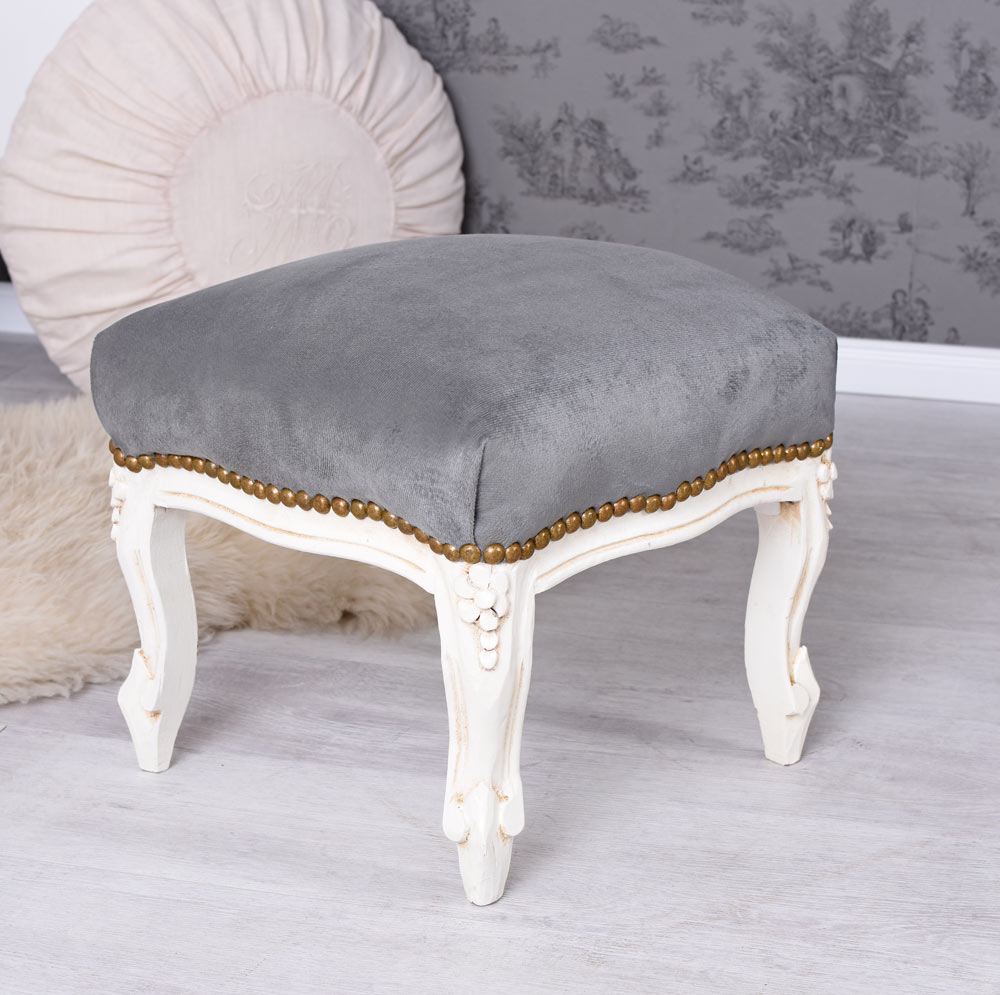 Das Fußbänkchen „Chateau Monfort“ in Creme-Weiß mit grauem Polsterbezug ist ein elegantes Barockmöbel, das klassische Formensprache mit moderner Zurückhaltung verbindet.